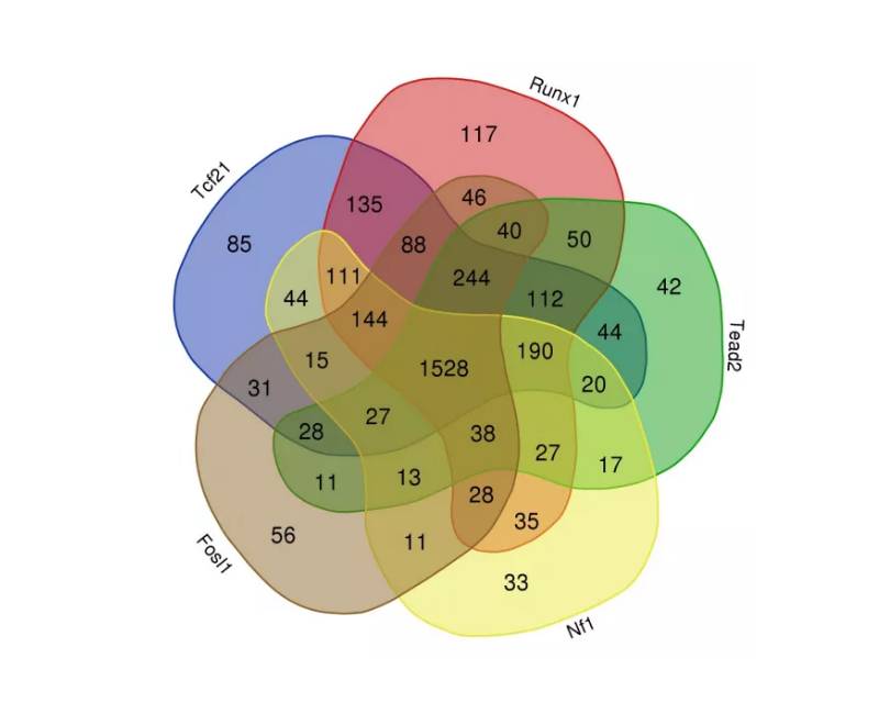 單個TF靶向的差異表達基因的比較結(jié)果揭示在Tcf21、Runx1、Tead2、Nf1 和 Fosl1 之間有著最大的交集(圖 8),表明許多與MI后心臟成纖維細胞的激活和分化相關(guān)的基因是受多個關(guān)鍵TF共同調(diào)節(jié)的。