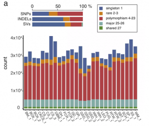 近年來,動物遺傳變異研究中,在牛、豬、狗、小鼠等物種中鑒定出了大量的SVs。例如,在62頭牛組成的群體中,鑒定得到了6,426個SVs,部分SVs位于乳品性狀的QTL內(nèi);利用全基因組測序數(shù)據(jù)構(gòu)建了豬的SVs變異圖譜,在分布全球的55個豬種的305個個體中鑒定得到了33,698個SVs,基于檢測的SVs進(jìn)行選擇清除分析,在梅山豬中鑒定到64個新的受選擇區(qū)域,其中的一些位點(diǎn)與繁殖性狀相關(guān);2021年發(fā)表在《Communication Biology》上的研究中,作者在27個不同的狗中鑒定了14,953,199個SNPs、6,958,645個indels和217,951個SVs(圖2)。
