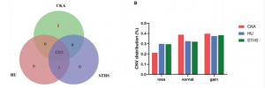 (1)例如,在416個奶山羊中鑒定得到了7,208個CNVs,GWAS分析發(fā)現(xiàn)31個CNVs所在區(qū)域與產(chǎn)奶量等性狀顯著相關(guān),并且發(fā)現(xiàn)在顯著相關(guān)的CNVs中,注釋的基因大多數(shù)在產(chǎn)奶相關(guān)的生物過程和健康相關(guān)性狀中發(fā)揮著重要作用。在另一個研究中,利用新開發(fā)的GWAScore方法整合已發(fā)表的GWAS數(shù)據(jù)來鑒定潛在的候選位點(diǎn),并對3個不同品種(CKA,n=10、HU,n=10、STHS,n=9)山羊進(jìn)行全基因組CNVs檢測(圖3),通過將CNVs與GWAScore和QTL位點(diǎn)相整合,發(fā)現(xiàn)197個候選基因與CNVs存在重疊,進(jìn)一步鑒定得到28個與生長性狀相關(guān)的CNVs。