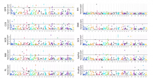 在牛的CNV變異研究中,利用已發(fā)表的1,116個牛中的鑒定的25,030個CNVs,基于不同性狀(功能、健康、繁殖等)的CNVs進(jìn)行GWAS,并評估其對養(yǎng)殖和育種實(shí)踐的影響,結(jié)果顯示,共有56個CNVs與8個表型性狀中的一個或多個顯著相關(guān),其中12號染色體上的3個CNVs與產(chǎn)脂性狀和乳腺性狀的顯著關(guān)聯(lián),這些CNVs位于23個不同的基因上,該研究是首次對如此大的瑞士奶牛樣本進(jìn)行基因組分析,將CNVs與繁殖、乳腺和健康性狀聯(lián)系起來。同樣,基于在528個荷斯坦奶牛中鑒定的197個CNVs(圖4),對473頭牛10個重要生產(chǎn)性狀進(jìn)行GWAS分析,共檢測到57個CNVs與至少一個性狀顯著相關(guān)(圖5),對這些CNVs與候選基因的潛在重疊進(jìn)行分析,預(yù)測得到一些表型相關(guān)的候選基因,該研究結(jié)果對荷斯坦奶牛的基因組鑒定了CNV,并提供了影響飼料效率和采食相關(guān)性狀變異的候選基因。