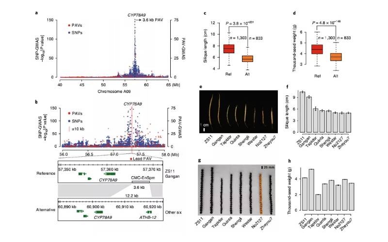 (2)在除水稻以外的作物中也有使用SVs進(jìn)行GWAS的報(bào)道。例如,在玉米中,521個自交系玉米基因組序列中的SVs被用于繪制玉米SV圖譜;在小麥中發(fā)現(xiàn)了影響染色體3B上基因和轉(zhuǎn)座元件的SV;在最近的一項(xiàng)木瓜研究中(使用栽培木瓜和野生木瓜),共鑒定出8083個SVs,其中包括5260個缺失,552個串聯(lián)重復(fù)和2271個插入,在該研究中,還發(fā)現(xiàn)CNVs與生長和對環(huán)境壓力的反應(yīng)有關(guān);在油菜中,基于鑒定得到的數(shù)百萬SVs和PAVs用于PAV-GWAS,直接鑒定到了莢果長度、種子重量和開花時間相關(guān)的結(jié)構(gòu)變異,這些是之前基于單核苷酸變異SNP進(jìn)行的GWAS所沒能鑒定出來的,充分說明了PAV-GWAS可以互補(bǔ)于SNP-GWAS用來鑒定特定性狀相關(guān)的位點(diǎn)(圖7);另外,其他植物SVs鑒定例子包括:溝酸漿屬的耐鹽性、葡萄的漿果顏色和番茄的馴化性狀等研究。