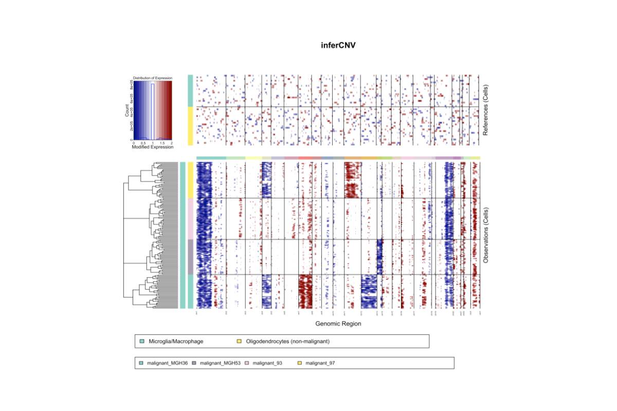 2014年發(fā)表在science(IF=47.728)上的《Single-cell RNA-seq highlights intratumoral heterogeneity in primary glioblastoma》[1],通過對(duì)基因相對(duì)表達(dá)水平來推斷每個(gè)細(xì)胞的大規(guī)??截悢?shù)變異(CNV)。該研究選擇正常人的腦組織bulk RNA-seq的數(shù)據(jù)作為對(duì)照,單細(xì)胞樣本聚為7組,無監(jiān)督分析確定了9個(gè)異常細(xì)胞,它們具有成熟少突膠質(zhì)細(xì)胞基因表達(dá)增加和膠質(zhì)母細(xì)胞瘤基因下調(diào)的特點(diǎn),剩余的420個(gè)細(xì)胞中沒有一個(gè)顯示出與非惡性細(xì)胞或免疫細(xì)胞類型的轉(zhuǎn)錄程序相似的特征。雖然非惡性細(xì)胞是腫瘤微環(huán)境的關(guān)鍵組成部分,但該研究通過解離和CD45+分選后,已經(jīng)很大程度上排除了非腫瘤細(xì)胞。該研究通過infer CNV有效地將腦膠質(zhì)母細(xì)胞瘤中的正常細(xì)胞與惡性細(xì)胞區(qū)分開來。