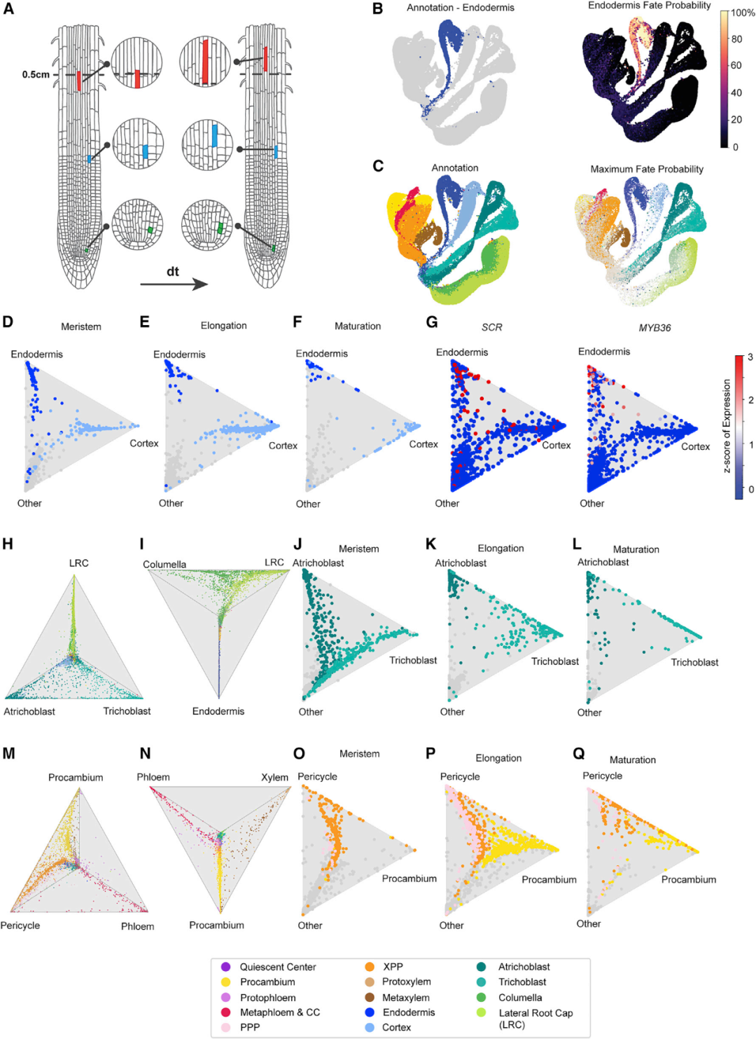 由于擬時(shí)序推理表明根細(xì)胞類(lèi)型以不同的速率成熟,于是作者利用基于理想傳輸理論OT(Optimal?Transport)的StationaryOT分析方法來(lái)推斷整個(gè)圖譜的發(fā)育軌跡。研究人員發(fā)現(xiàn)它可以在很大程度上獨(dú)立于圖譜注釋和細(xì)胞系分割,來(lái)推斷細(xì)胞系的發(fā)育軌跡,反映每種細(xì)胞和組織類(lèi)型分化的現(xiàn)有生物學(xué)知識(shí)。分化事件可以通過(guò)將多個(gè)命運(yùn)概率以“三角圖”的形式投影到重心坐標(biāo)中來(lái)實(shí)現(xiàn)可視化。作者利用“三角圖”分別展現(xiàn)了分生區(qū)、伸長(zhǎng)區(qū)、成熟區(qū)的內(nèi)皮層和皮層細(xì)胞的命運(yùn)概率(圖4D-F)。已知內(nèi)皮層標(biāo)記基因SCARECROW?(SCR)?和MYB36的表達(dá)模式與伴隨細(xì)胞成熟而不斷增加的內(nèi)皮層命運(yùn)概率相一致(圖4G)。之后按照發(fā)育區(qū)對(duì)生毛細(xì)胞、非生毛細(xì)胞(圖4J-L),中柱鞘、原形成層(圖4O-Q)也繪制“三角圖”。此外,理想傳輸理論也有助于識(shí)別發(fā)育調(diào)節(jié)因子。
