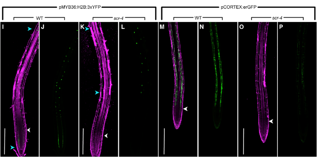 圖6-2 野生型和scr突變體中MYB36和CORTEX(皮層轉(zhuǎn)錄報(bào)告)基因的空間表達(dá)模式