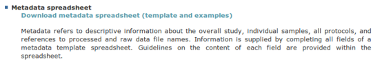可以看見我們上傳數(shù)據(jù)需要準備三個文件,分別為:Metadata spreadsheet、Processed data files、Raw data files。下面分別介紹每個文件如何填寫以及準備。