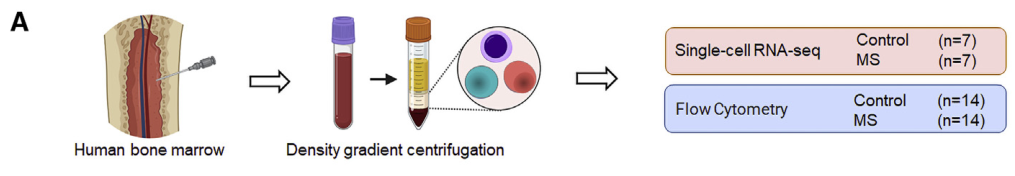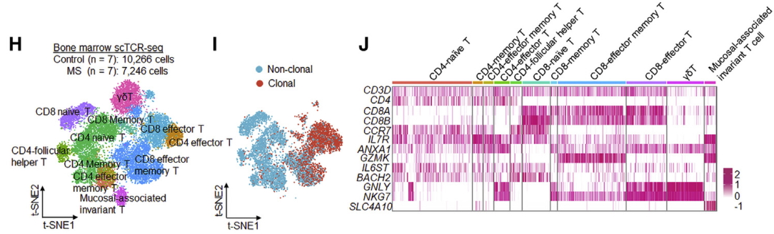 樣本設(shè)計(jì):MS患者及健康對照各7例,取骨髓樣本,進(jìn)行scRNA-seq+scTCR-seq。