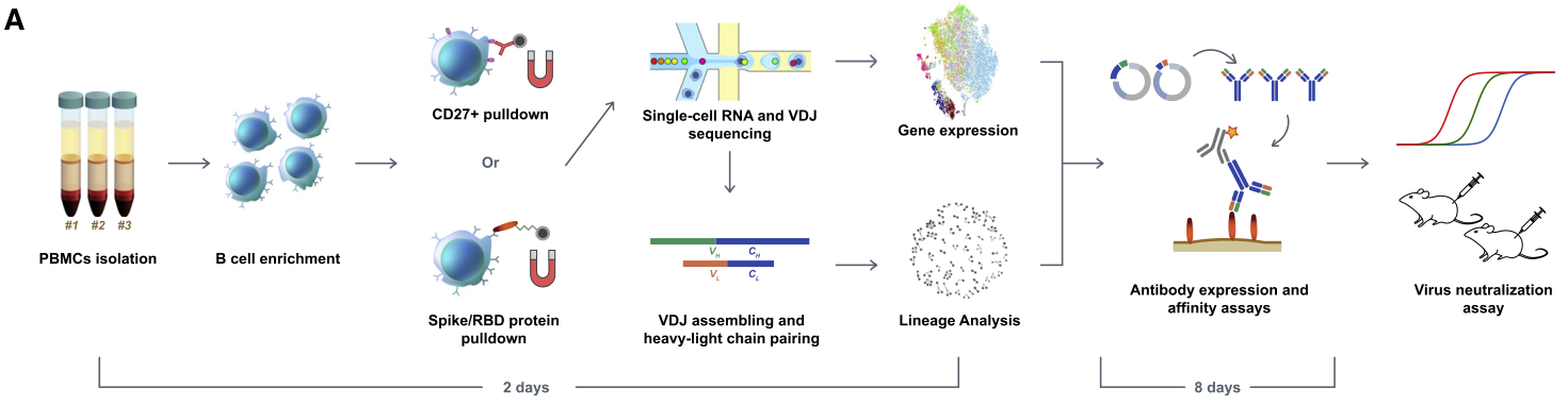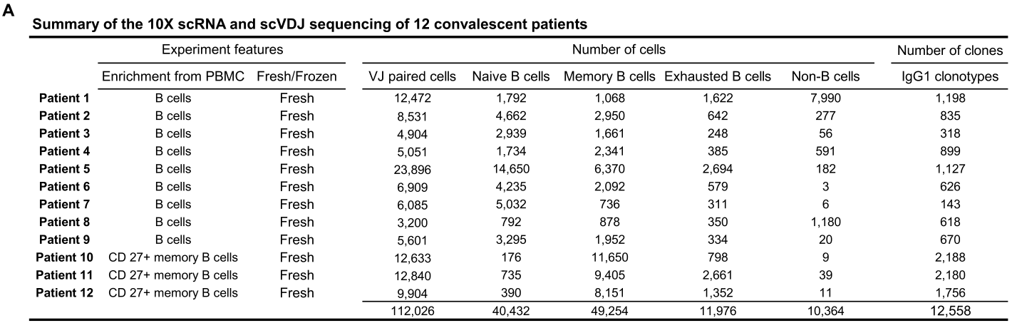 樣本設(shè)計(jì):從12個(gè)COVID-19康復(fù)患者的外周血單核細(xì)胞PBMC中分離B細(xì)胞,對B細(xì)胞和CD27+記憶B細(xì)胞進(jìn)行scRNA-seq + scBCR-seq,獲得IgG1亞型抗體,并進(jìn)行抗體體外檢測和篩選。