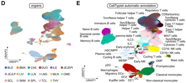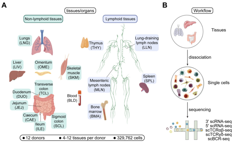 樣本設(shè)計(jì):2個(gè)成人捐獻(xiàn)者的16份組織樣本,分別進(jìn)行scRNA、scTCR、scBCR,實(shí)驗(yàn)中采集的組織樣本包括初級淋巴器官(骨髓)和次級淋巴器官(脾、肺引流和腸系膜淋巴結(jié))、粘膜組織(腸和肺)以及血液和肝臟等非淋巴組織,還包括胸腺、骨骼肌和網(wǎng)膜。