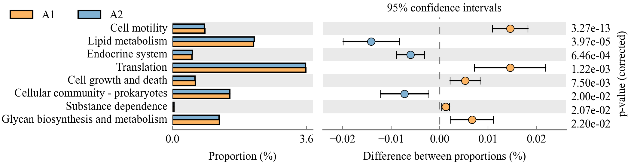 PICRUSt 2 將特征序列(16S rRNA)與微生物基因組數(shù)據(jù)庫(IMG,Integrated Microbial Genomes)參考序列對齊(aliign)構(gòu)建進(jìn)化樹,找到特征序列的“最近物種”,并根據(jù)已知物種的基因種類和豐度信息預(yù)測未知物種的基因信息,從而結(jié)合基因的KEGG通路信息預(yù)測整個群落的通路情況。通過組間差異分析,得到在組間具有顯著差異的功能,最后利用Stamp對結(jié)果進(jìn)行差異可視化。