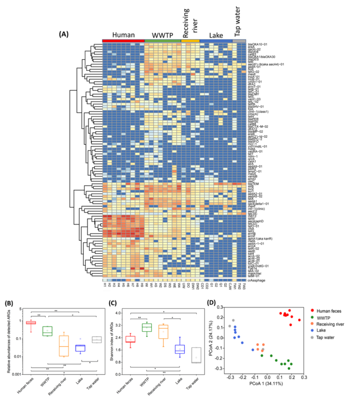 ARG多樣性也隨著水從污水處理廠向自來水的輸送而減少(1C)。所有樣本的ARG譜的PCoA表明,不同類型的樣本包含顯著不同的ARG成分。從環(huán)境樣品中分離出人類糞便中的ARGs(圖1D),表明腸道具有獨特的ARG圖譜。這可能是因為與環(huán)境相比,腸道的條件不同。來自污水處理廠和受納河水的樣品聚在一起較近,證實了污水處理廠出水的排放對受納河中的ARGs有很大影響。同樣,湖泊和自來水更傾向于聚集在一起,與所研究的湖泊都是自來水水源一致。上述結(jié)果表明,在所研究的樣品中普遍存在ARGs,污水處理廠攜帶的ARGs可能污染不同的受納水體。