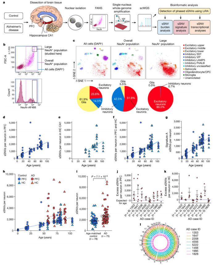 對從AD和神經(jīng)典型對照個體的大腦中分離出來的神經(jīng)元進行了單細胞全基因組測序(scWGS),染色了泛神經(jīng)元標(biāo)記NeuN來標(biāo)記神經(jīng)元,并進一步只標(biāo)記了大的NeuN陽性核,使用多位移放大(MDA)進行全基因組擴增,分析了8例AD的91個神經(jīng)元和18個神經(jīng)典型對照組的159個神經(jīng)元。在神經(jīng)典型個體中,神經(jīng)元sSNVs隨著年齡的增長而增加,sSNVs的年增長率相當(dāng)高,從每年13到55個sSNV不等,在一些特殊細胞類型中,分裂突變率更高。沒有神經(jīng)診斷的個體的海馬CA1神經(jīng)元顯示,隨著年齡的增長,sSNVs呈積累的趨勢,這與神經(jīng)典型對照個體前額葉皮層(PFC)神經(jīng)元中看到的sSNV的增加沒有顯著差異。