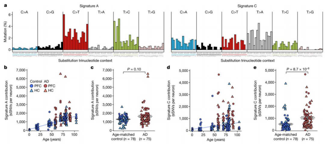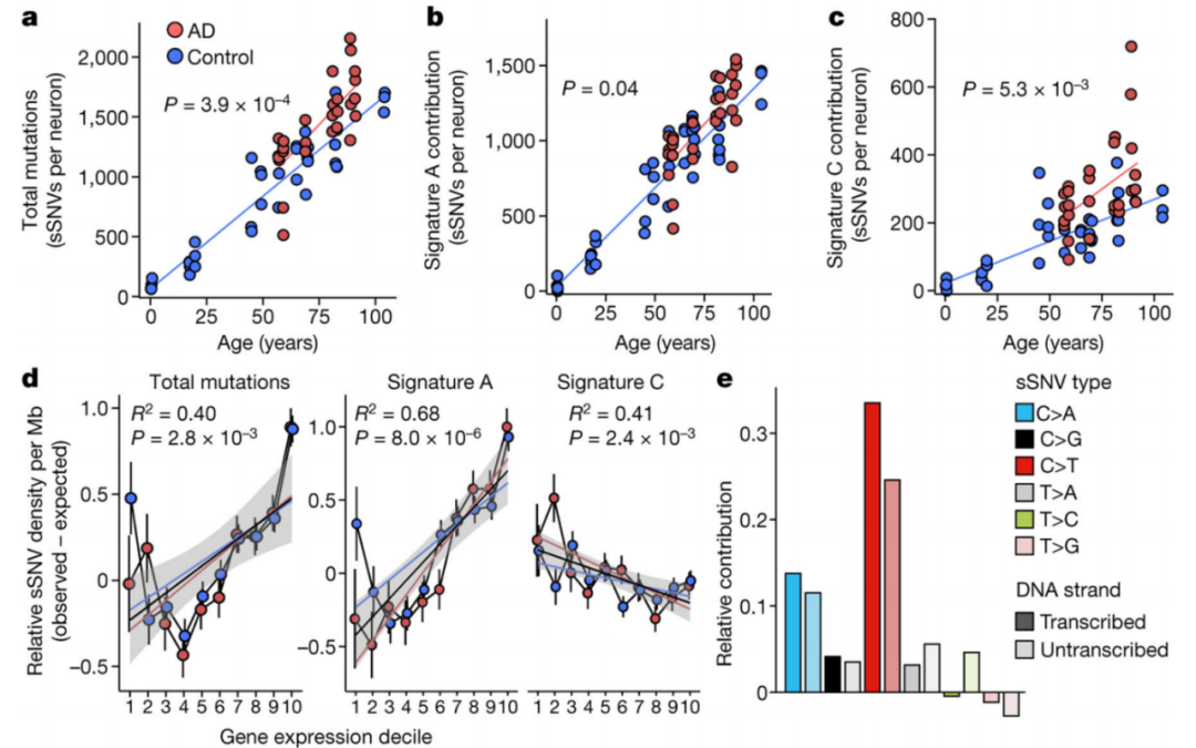 阿爾茨海默氏癥的癡呆癥隨著神經(jīng)變性的進展而發(fā)展,但導(dǎo)致神經(jīng)元功能障礙和死亡的具體事件仍然鮮為人知。在正常衰老期間,神經(jīng)元以類似于分裂細胞的速度逐漸積累軀體突變,這表明遺傳因素、環(huán)境暴露或疾病狀態(tài)可能會影響這種積累在這里,本文分析了來自阿爾茨海默病患者和神經(jīng)典型對照個體前額葉皮層和海馬體的319個神經(jīng)元的單細胞全基因組測序(scWGS)數(shù)據(jù)。發(fā)現(xiàn)阿爾茨海默氏癥患者的體細胞DNA改變增加,分子模式不同,正常神經(jīng)元主要以與年齡相關(guān)的模式(特征A)積累突變,這與之前在健康和癌細胞中描述的“時鐘狀”突變特征非常相似。神經(jīng)變性中DNA改變的異常積累為阿爾茨海默病發(fā)展過程中發(fā)生的分子和細胞事件的級聯(lián)提供了見解。