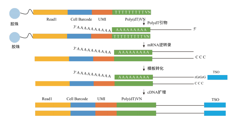 GEMs形成后,細(xì)胞裂解釋放出mRNA;同時膠珠也會自動溶解,釋放出大量含有Barcode序列的引物,并利用引物末端的Ploy(dT)VN序列捕獲液滴中的mRNA,并在一個個GEM中獨(dú)立完成mRNA逆轉(zhuǎn)錄,產(chǎn)生帶有Barcode和UMI信息的cDNA。隨后“油包水”結(jié)構(gòu)裂開,進(jìn)行cDNA擴(kuò)增。