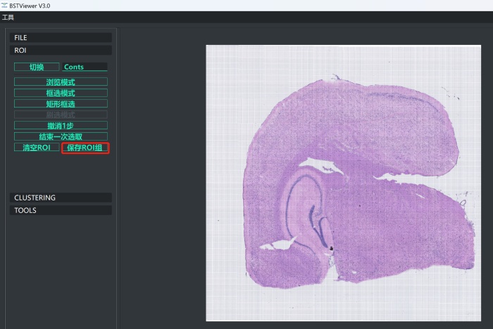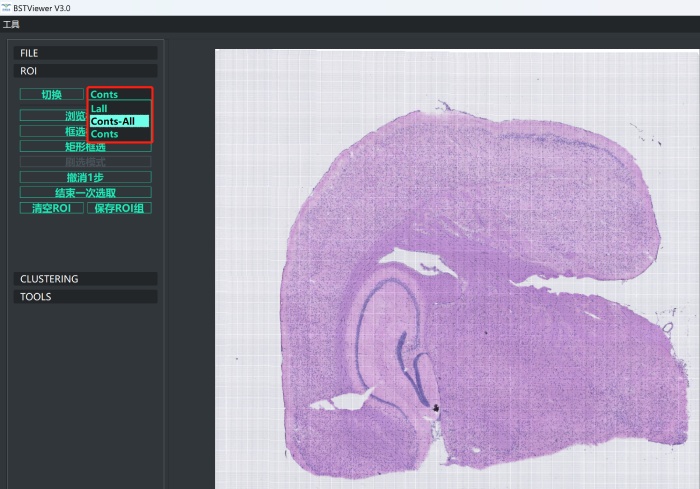 4)進行ROI 創(chuàng)建。點擊“ROI”按鈕,此處可以選擇全局聚類和部分區(qū)域聚類。cont和conts-all分別代表在全局下聚類與全局扣除空白區(qū)域聚類。區(qū)域聚類的話目前提供了“框選模式”和“矩形框選”兩種模式??蜻x合適的區(qū)域后點擊“結(jié)束一次選取”,選擇“保存或摳除”,完成之后點擊“保存ROI組”并命名即可;