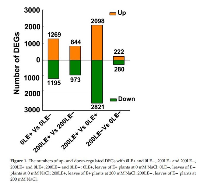 進(jìn)一步闡明E.gansuensis在NaCl脅迫下對寄主植物生長的分子機(jī)制,E+和E-A.inebrians葉片(28天齡)的轉(zhuǎn)錄組通過Illumina測序進(jìn)行分析。E+A.inebrians和E-A.inebrians用含0mMNaCl和200mMNaCl濃度處理。閾值FDR≤0.01和FC≥2用于確定DEG(差異表達(dá)基因)。結(jié)果顯示響應(yīng)E.gansuensis的轉(zhuǎn)錄本發(fā)生顯著變化,在0mMNaCl和200mMNaCl濃度下的分別發(fā)生2464和1817DEGs(圖1)。此外,在NaCl脅迫下,轉(zhuǎn)錄本發(fā)生了顯著變化,E+葉子的4919個(gè)DEG。然而,一個(gè)小的轉(zhuǎn)錄組變化發(fā)生在對NaCl脅迫的響應(yīng),E-葉為502DEG(圖1)。