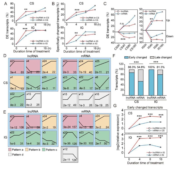 為了進(jìn)一步分析lncRNA和mRNA的表達(dá)模式,使用了短時間序列表達(dá)挖掘器(ShortTime-seriesExpressionMiner,STEM)對基于表達(dá)的轉(zhuǎn)錄本進(jìn)行聚類。在CS期間,將214個lncRNA和242個mRNA分別分為8個和9個重要的表達(dá)譜(圖3D)。其中l(wèi)ncRNA表達(dá)譜15以及mRNA表達(dá)譜15、13和16直到群居化處理后8或16小時才改變。這些配置文件稱為后期更改的配置文件(模式d)。與后期更改的配置文件相反,早期更改的配置文件以4小時時間點(diǎn)開始的轉(zhuǎn)錄表達(dá)變化為特征。根據(jù)4小時后的表達(dá)變化,將早期變化的輪廓細(xì)分為模式a(早期變化)、模式b(早期中變化)和模式c(可持續(xù)變化)。在IG過程中,269個lncRNA和639個mRNA分別聚集成6個和7個顯著表達(dá)譜。所有l(wèi)ncRNA配置文件均為早期變化(圖3E)。在mRNA表達(dá)譜中,有6個是早期改變的,而譜12是晚期改變的。在CS和IG期間,lncRNA的聚類分布圖的數(shù)量與mRNA的分布無明顯差異。但是,通過計算譜圖中的轉(zhuǎn)錄本數(shù)量,發(fā)現(xiàn)早期改變的lncRNA的百分比比CS中的mRNA的百分比高61.1%(88.3%vs.54.8%,圖3F)。同樣,IG中早期改變的lncRNA的百分比高于IG中的mRNA(100%vs.81.3%,圖3F)。因此,lncRNA比mRNA對散居化和群居化處理的反應(yīng)更快。在CS中,早期改變的lncRNA的表達(dá)變化速率快于285個mRNA的表達(dá)變化速率(0.55vs.0.24)和IG(0.77vs.0.39)(圖3G)。因此,早期改變的lncRNA的比例和表達(dá)變化率高于早期改變的mRNA。因此,蝗蟲lncRNA比mRNA對種群密度的變化更敏感。
