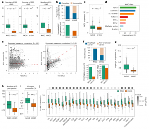 與UHGG數(shù)據(jù)庫相比,IMGG數(shù)據(jù)庫中前噬菌體基因組的分辨率有了很大提升。該方法在95%的IMGG中都能檢測到前噬菌體序列(與UHGG(55%)相比)。IMGG和UHGG每個基因組編碼前噬菌體的平均數(shù)量分別為4個和1個。IMGG中的前噬菌體序列的連續(xù)性也較高,N50長度為37974 bp(UHGG中為31064 bp;圖3f);IMGG中前噬菌體編碼區(qū)的基因組比例是UHGG的4.2倍(圖3g)。與UHGG相比,IMGG中的IS區(qū)域更加jing q,表現(xiàn)在在每個物種的IS區(qū)域總拷貝數(shù)(增加了三倍;圖3h)和IS編碼區(qū)域的基因組比例(增加了近四倍;圖3i)。IS類別中改善程度*高的是IS1380(與UHGG相比,改善了5.6倍),其次是IS5、IS1634和ISAS1(分別是5.5倍、5.5倍和5.3倍;圖3j)。