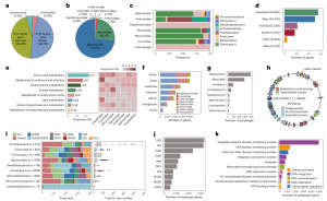 接下來,對IMGG數(shù)據(jù)庫中的前噬菌體基因組進(jìn)行深入分析,以探究其功能能力。從12834個物種水平的vOTU代表性基因組中鑒定出596193個蛋白質(zhì)編碼基因,并將這些假定基因與幾個常見的功能和/或病毒注釋數(shù)據(jù)庫進(jìn)行了比較。結(jié)果表明,僅有55.4%的前噬菌體基因在功能上能夠被分類,而44.6%的基因與任何交叉比較的數(shù)據(jù)庫都不具有同源性,被分配給了未知的功能(圖5d)。這些結(jié)果表明,盡管攜帶ARG的噬菌體很少存在于腸道微生物中,但這些噬菌體可能編碼ARG(例如,A163.CMAG_1_1_7_59800編碼假定的β-內(nèi)酰胺酶基因;圖5h),可能成為ARG轉(zhuǎn)移的關(guān)鍵載體,并對人類健康造成嚴(yán)重威脅。這些結(jié)果表明,腸道前噬菌體在分類和功能上比先前我們所了解的更加多樣化。