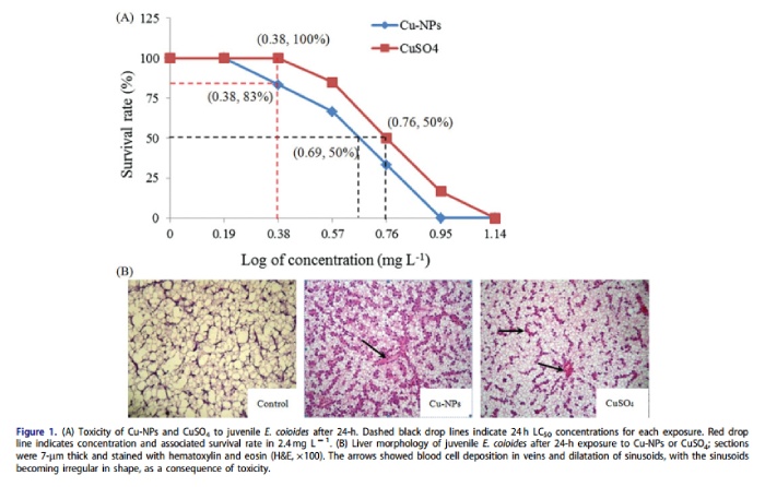 石斑魚被暴露在不同濃度(1.6,1.6,2.4,3.7,5.8或9.0毫克的cu l 1)的cu-np中。這些濃度是根據(jù)初步實驗選擇確定。在暴露期間,魚不被喂食,死魚被移除。急性暴露時間持續(xù)24小時,并在結(jié)束時評估魚的死亡率。