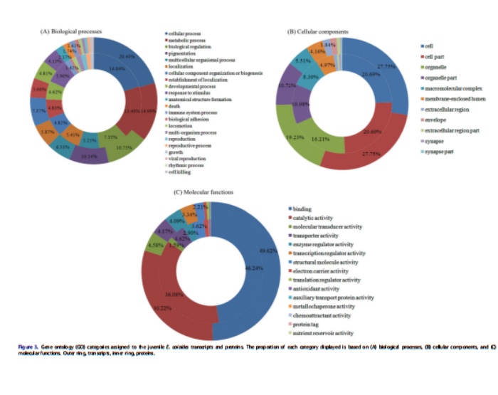3294個蛋白及11619轉(zhuǎn)錄本被功能注釋到(圖4)。這些轉(zhuǎn)錄本和蛋白質(zhì)分別分布在25和24個COG類別中,其中“僅一般功能預(yù)測”是轉(zhuǎn)錄本的較大組(總共1732個)和蛋白質(zhì)(630),之后是“信號轉(zhuǎn)導(dǎo)機制”,“翻譯后修飾、蛋白質(zhì)翻轉(zhuǎn)、伴侶”、“功能未知”、“轉(zhuǎn)錄”、“細(xì)胞內(nèi)轉(zhuǎn)運、分泌和囊泡轉(zhuǎn)運”、“細(xì)胞骨架”和“RNA加工和修飾”。在“脂質(zhì)轉(zhuǎn)運和代謝”這類中轉(zhuǎn)錄本3.2%(總共372個)和蛋白質(zhì)4.6%(153)