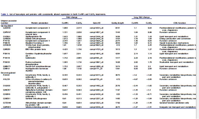 用蛋白質(zhì)組學(xué)分析方法獲得的差異表達(dá)蛋白與mRNA進(jìn)行了比較分析;根據(jù)他們的氨基酸序列來匹配轉(zhuǎn)錄本,在Cu-NPs組與對照組及CuSO4和對照組相比較,分別共140(100%)和352(99.4%)個差異表達(dá)的蛋白。我們進(jìn)一步確定在兩種銅粒子下蛋白和基因的表達(dá)是否一致,發(fā)現(xiàn)21的轉(zhuǎn)錄和蛋白在同一方向改變(13個上調(diào),八個下調(diào))(表2)。有趣的是,大多數(shù)基因(16個基因)的表達(dá)在Cu-NPS比CuSO4更強烈,但是蛋白質(zhì)卻相反。
