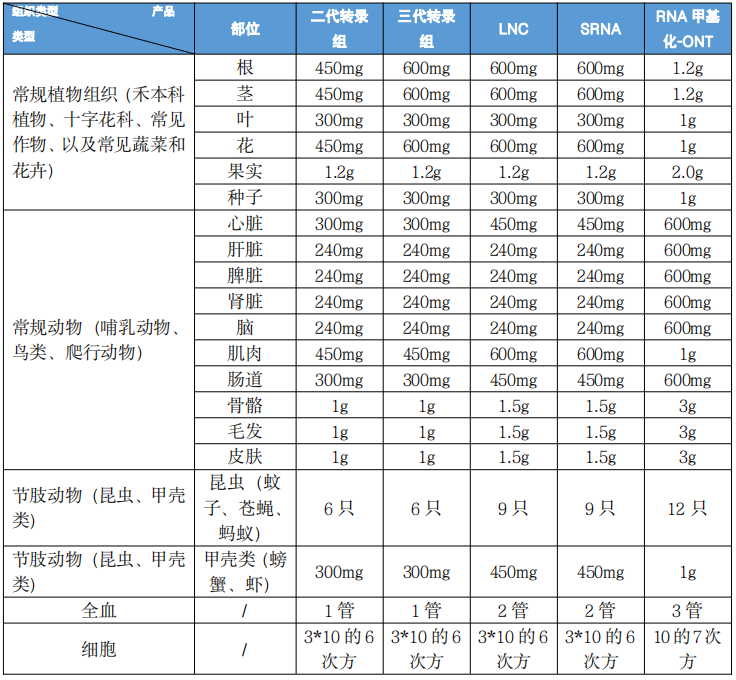 2) 組織送樣量:建議送樣量適用于 95%的物種組織,少部分組織因胞內(nèi)核酸量較低,需適當(dāng)增加送樣量,比如動(dòng)物皮膚、毛發(fā),植物果實(shí)、根等。請(qǐng)嚴(yán)格按照上方組織送樣量要求送樣,送樣量過少或過多均不利于提取實(shí)驗(yàn)。采樣量較少會(huì)導(dǎo)致提取的 RNA 總量、濃度不合格,采樣量過多反而會(huì)造成速凍不徹底、提取取樣困難、凍融降解等危險(xiǎn)。