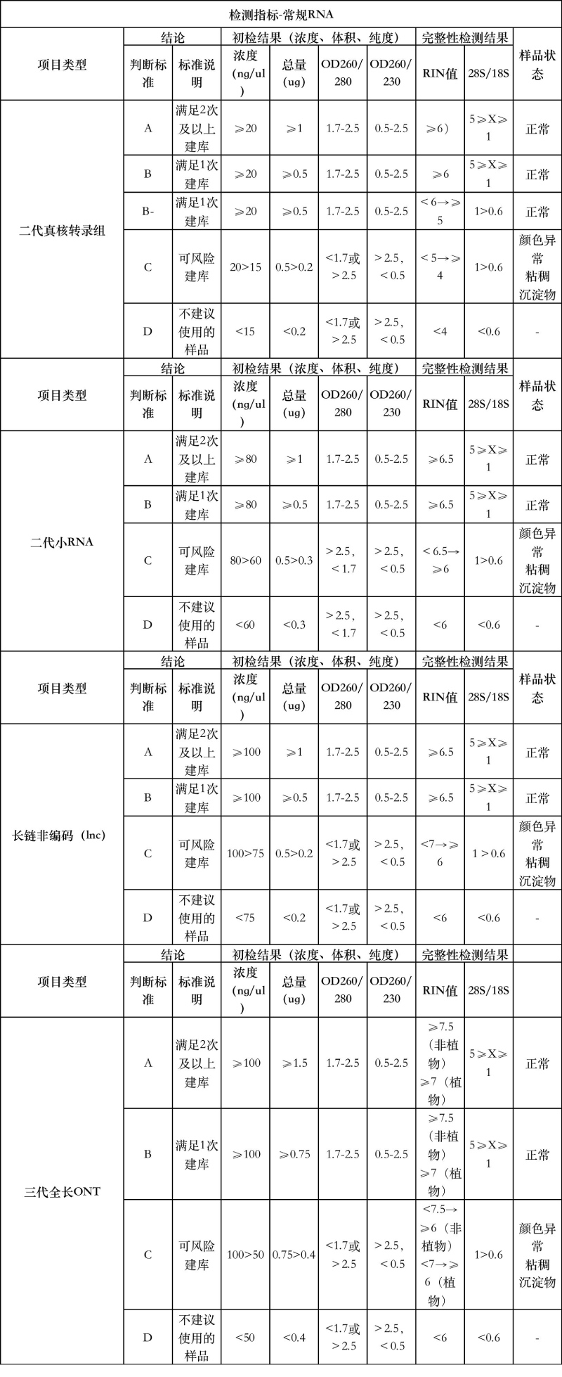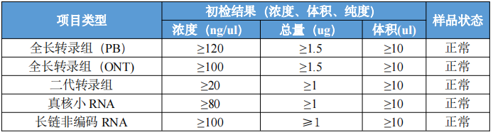 2、以上均是單個(gè)文庫的總量要求,如果樣品做多個(gè)文庫按(小 RNA>LNCRNA>轉(zhuǎn)錄組 RNA)判??偭坎蛔愕奈膸煊袠悠放?C 不通過,無不合格原因,根據(jù)二次提取的總量判定。無樣品根據(jù)剩余總量判判定下一文庫。