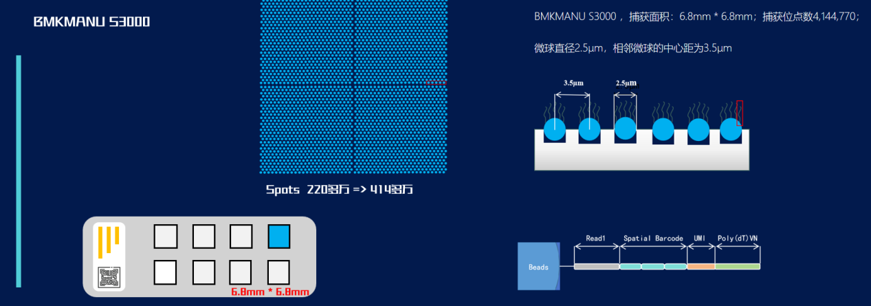 百創(chuàng)S3000在6.8mm*6.8mm的捕獲區(qū)域內(nèi)鋪設(shè)了4,144,770個捕獲位點(diǎn),相鄰兩個捕獲位點(diǎn)的中心距為3.5μm。