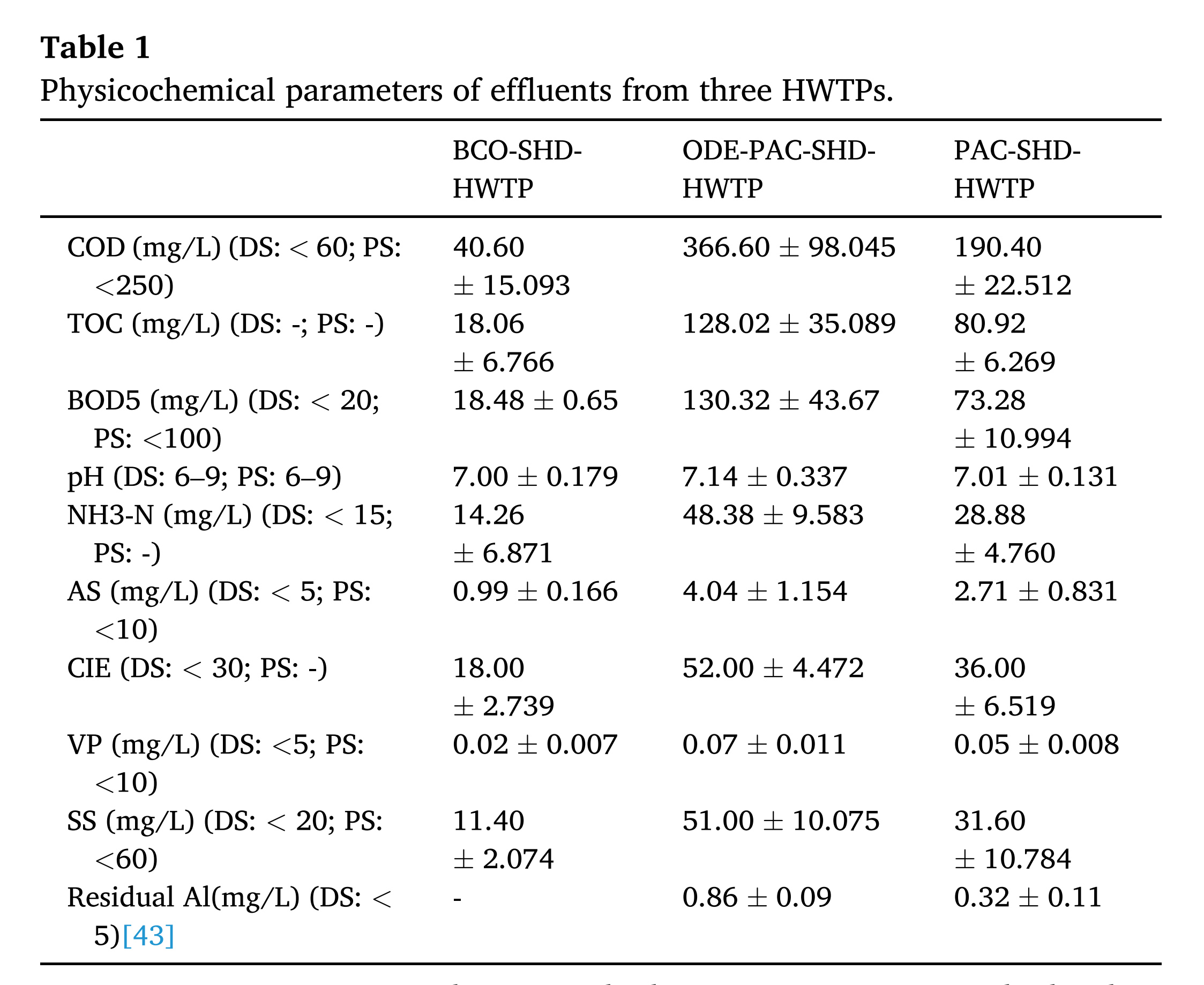 該研究共同評估了九種常見的理化指標,這些指標在三個污水處理廠的出水點表現(xiàn)出明顯的梯度分布。在這些指標上,ODE-PAC-HWTP 超過了 PAC-HWTP,PAC-HWTP 超過了 BCO-HWTP。BCO-HWTP出水中COD、BOD5、pH、NH3-N、AS、Color、VP、SS等濃度基本符合國家排放標準。PAC-HWTP 出水的 COD、BOD5、pH、NH3-N、AS、顏色、VP 和 SS 水平通常符合國家預(yù)處理標準,允許排放到通向市政污水處理廠的下水道中。相反,ODE-PAC-HWTP出水中COD和BOD5的濃度超過國家預(yù)處理標準。此外,還對兩個經(jīng) PAC 處理的 HWTP 出水中的殘留鋁濃度進行了測試。在 ODE-PAC-HWTP 和 PAC-HWTP 的出水中,檢測到的殘留 Al 濃度分別為 0.86 ± 0.09 mg/L 和 0.32 ± 0.11 mg/L。這些值符合 2002 年環(huán)境保護法制定的鋁廢水排放標準,該標準規(guī)定限值為 5.0 mg/L 。