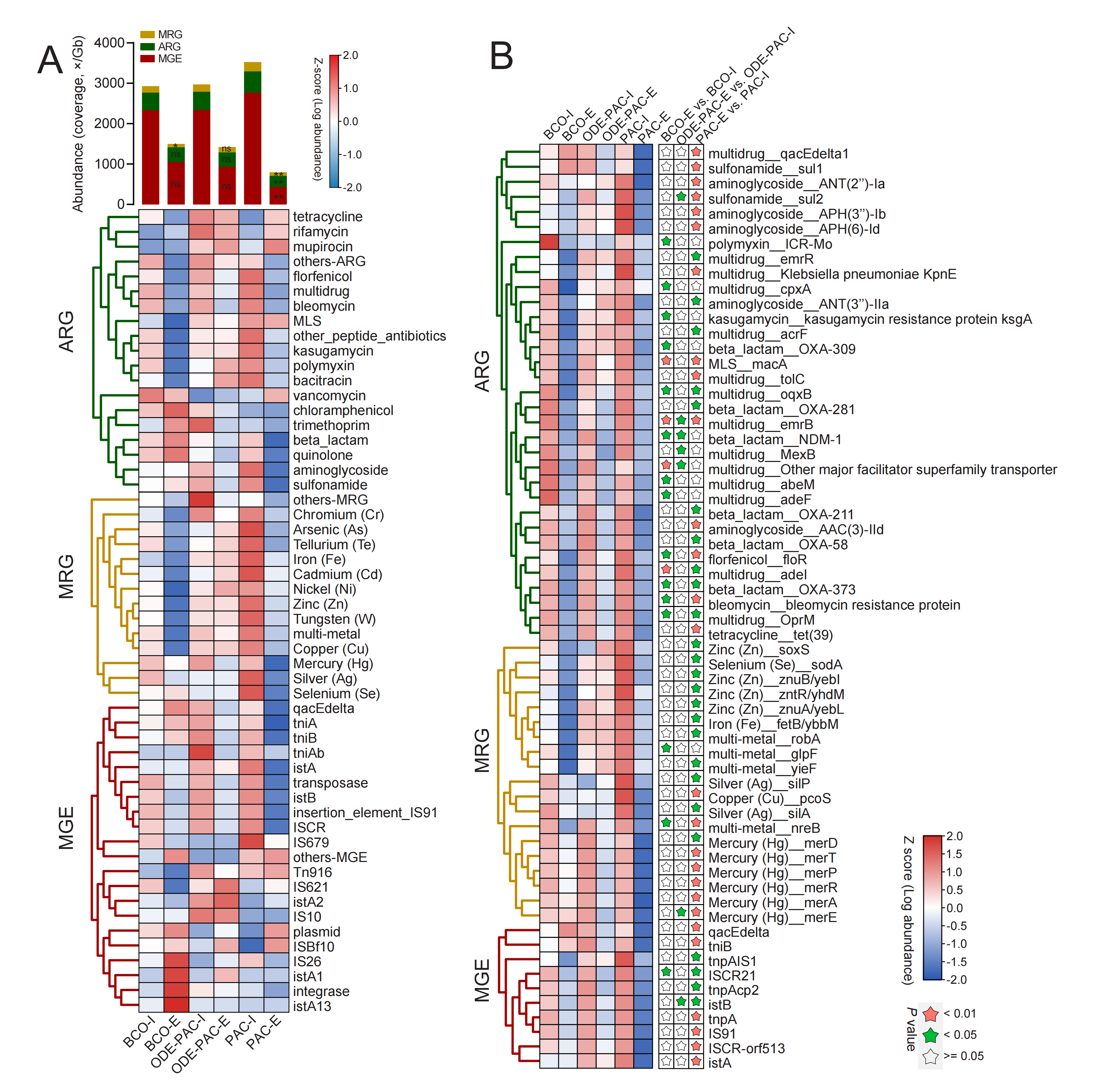 在三個 HWTP 的進水和出水中鑒定出了來自 17 個 MRG 類型的 194 個 MRG 亞型。在三個 HWTP 的污水中,總 MRG 相對豐度始終低于進水;然而,統(tǒng)計分析表明僅 BCO-HWTP 和 PAC-HWTP 的數(shù)據(jù)存在顯著差異(圖2A)。BCO-HWTP、ODE-PAC-HWTP和PACHWTP中MRG相對豐度的平均去除效率分別為42.08%、19.92%和57.54%。BCO-HWTP和PAC-HWTP出水中MRG的總相對豐度低于ODE-PAC-HWTP。主要的 MRG 類型包括多金屬、汞 (Hg)、銅 (Cu)、砷 (As)、鋅 (Zn)、銀 (Ag) 和鎳 (Ni)。與 BCO-HWTP 和 ODE-PAC-HWTP 相比,PAC-HWTP 中多種 MRG 類型的相對豐度在出水中低于進水中(圖2A)。在三個 HWTP 的廢水中,觀察到 19 種 MRG 的相對豐度顯著降低。具體來說,BCO-HWTP 中 2 個 MRG 的減少,ODE-PAC-HWTP中 1個 MRG 的減少,PAC-HWTP 中 18 個 MRG 的顯著減少(圖2B)。這些結(jié)果表明,與ODEPAC-HWTP 相比,BCO-HWTP 和 PAC-HWTP 能更有效地去除 MRG。