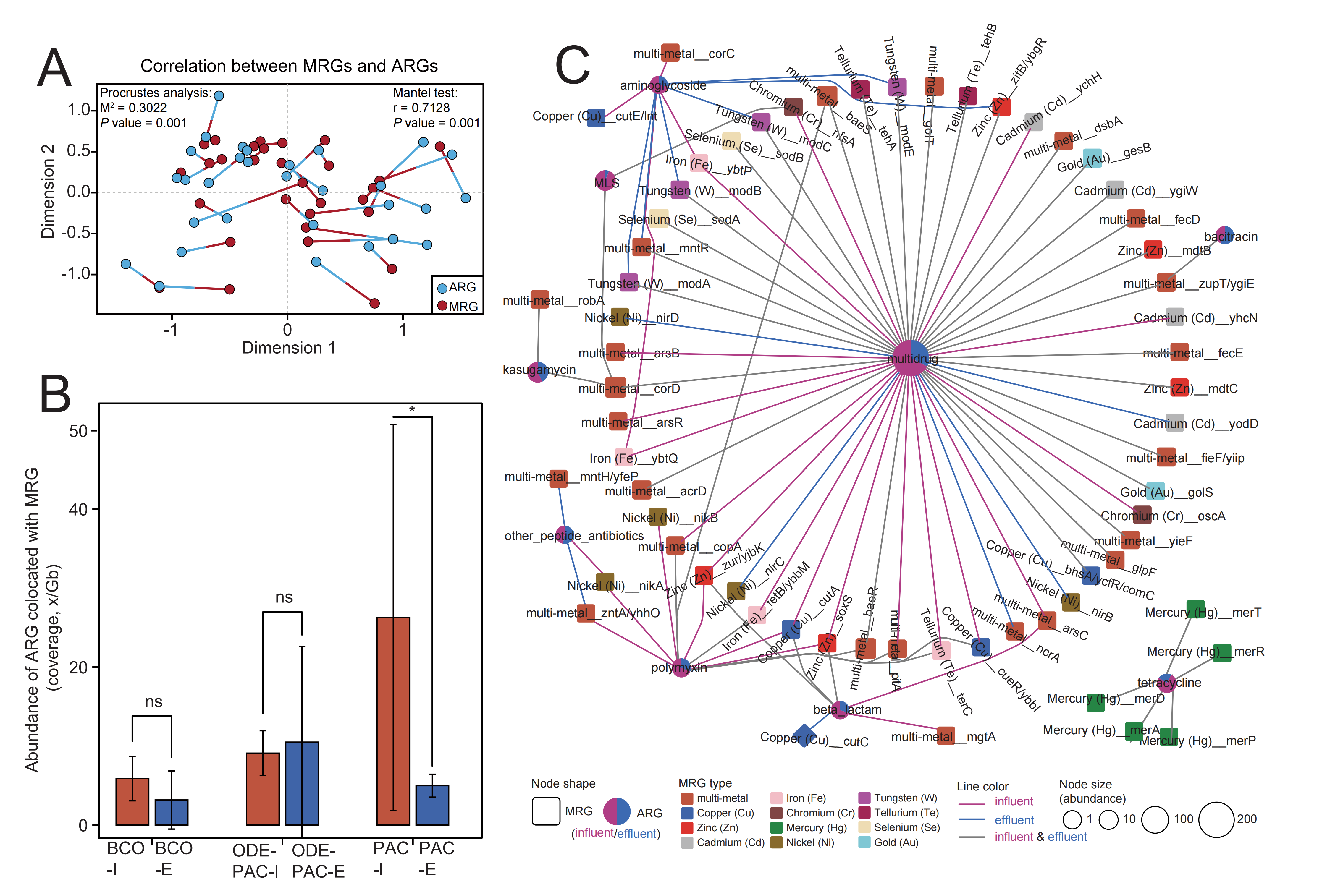 研究了HWW中ARGs和MRGs的豐度之間的關(guān)聯(lián),以確定ARGs共同選擇的相對影響。Mantel測試和Procrstes分析表明,ARG和MRG之間的成分相似性在統(tǒng)計上具有顯著的一致性(圖3a)。在PAC-HWTP和BCO-HWTP出水中,與MRGs基因共處的ARGs的相對豐度低于進水中的ArGs。然而,統(tǒng)計分析表明,只有來自PAC-HWTP的數(shù)據(jù)存在顯著差異。相反,在ODE-PAC-HWTP的出水中,與MRGs基因共存的ArGs的相對豐度呈現(xiàn)出增加的趨勢(圖3B)。共有9種類型的ARG與65個MRG亞型遺傳共存。共確定了92個不同的ARG-MRG(一對一)遺傳共定位關(guān)系(圖3C)。在這些關(guān)系中,48個同時在進水和出水中檢測到,30個專門在進水中發(fā)現(xiàn),14個專門在出水中發(fā)現(xiàn)。與MRG共存的最常見的ARG型是多藥耐藥。HWTP出水中氨基糖苷類、β-內(nèi)酰胺類、卡蘇霉素、MLS、多藥、多粘菌素和四環(huán)素基因的相對豐度始終低于進水。然而,其他多肽抗生素基因的相對豐度在HWTP的進水和出水中仍然是相當?shù)?。只有桿菌素抗性基因在HWTP出水中的相對豐度高于進水。此外,汞(Hg)抗性基因與四環(huán)素抗性基因表現(xiàn)出排他性的遺傳共定位,反過來,四環(huán)素抗性基因也與汞(Hg)抗性基因表現(xiàn)出排他性的遺傳共定位。
