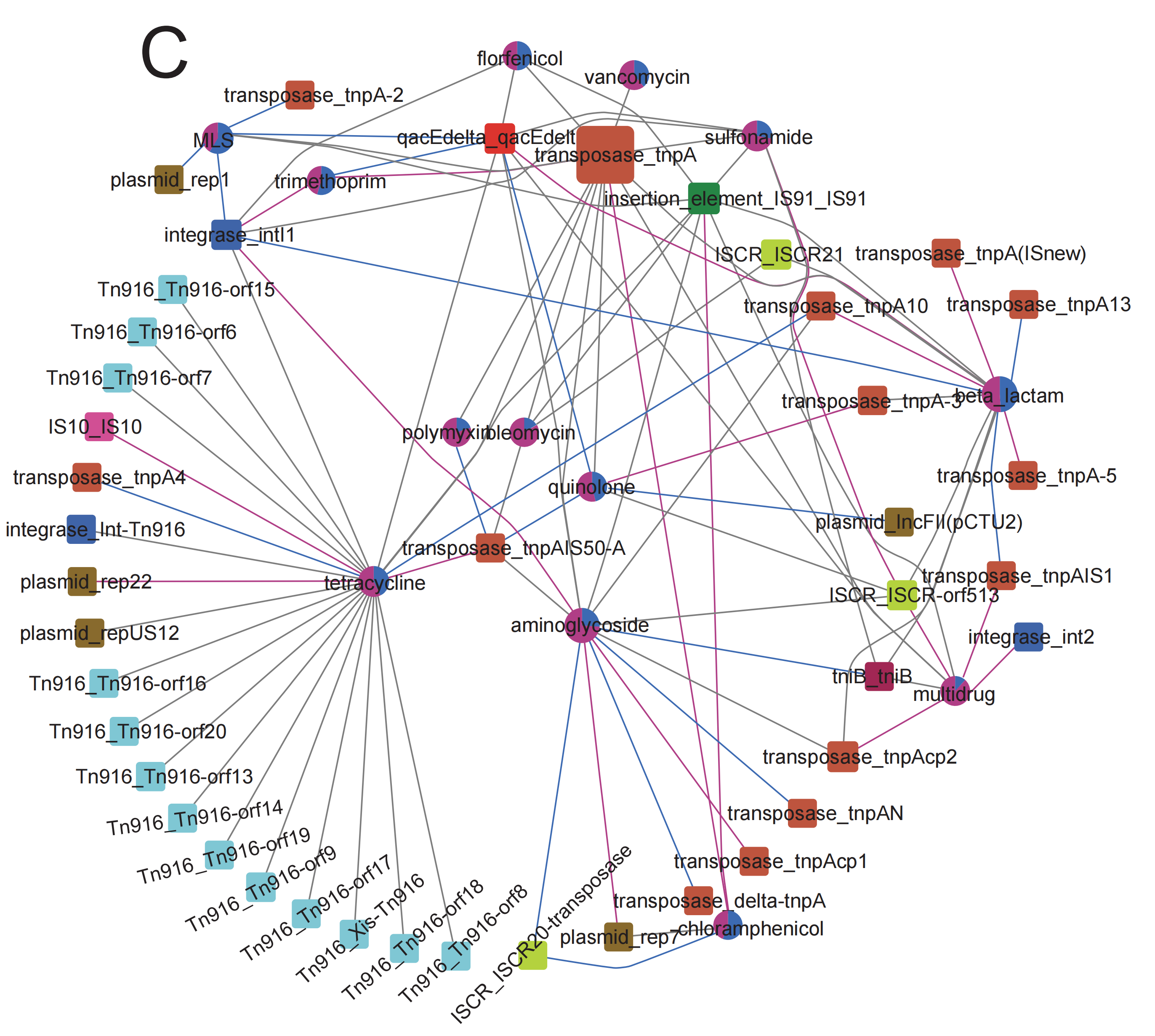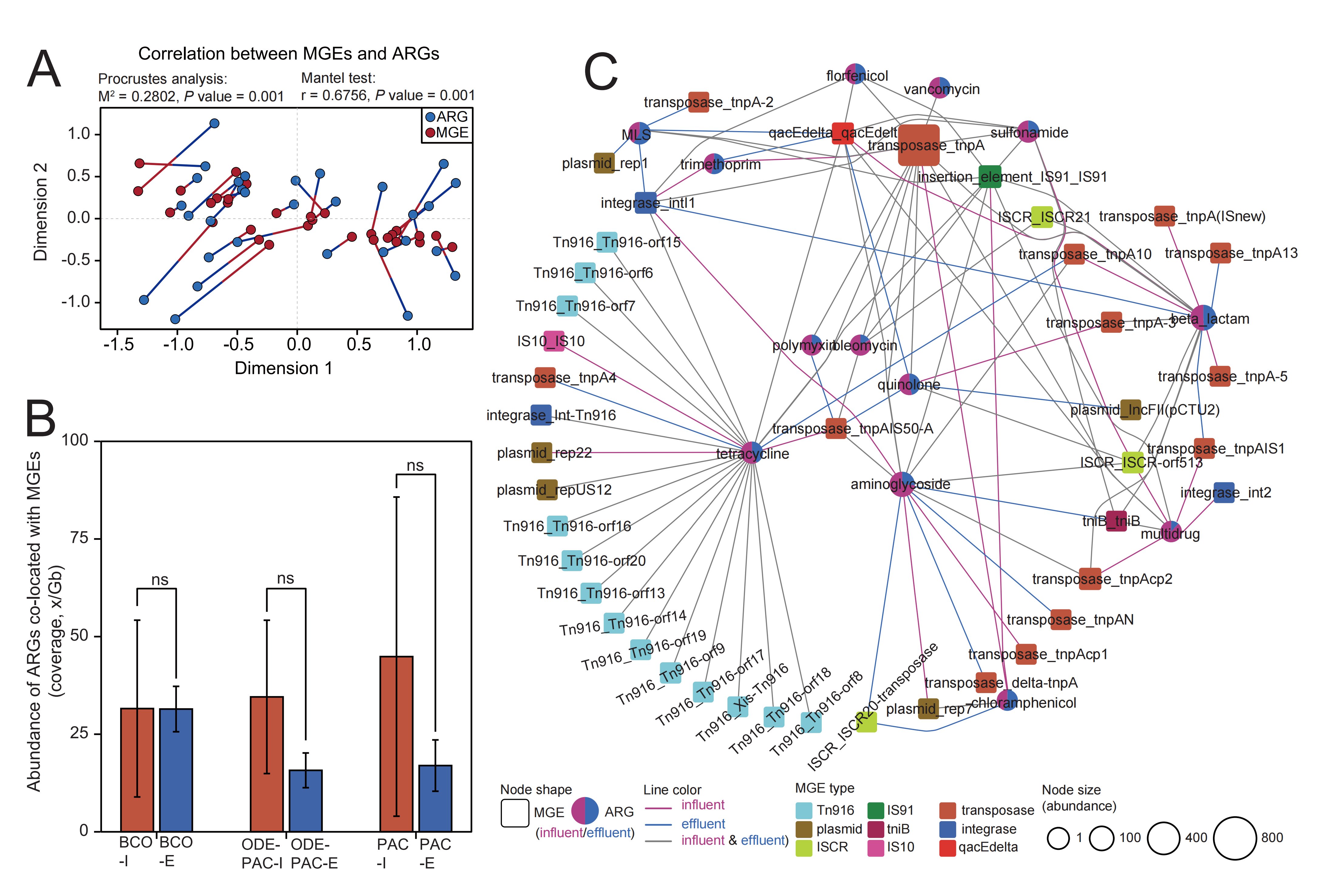 圖3-(A)Procrstes分析和Mantel檢驗。(B)三個熱泵的進水和出水中與MRG共存的ARG的相對豐度的差異。(C)顯示MRG和ARG類型同時出現(xiàn)的網(wǎng)絡(luò)圖。