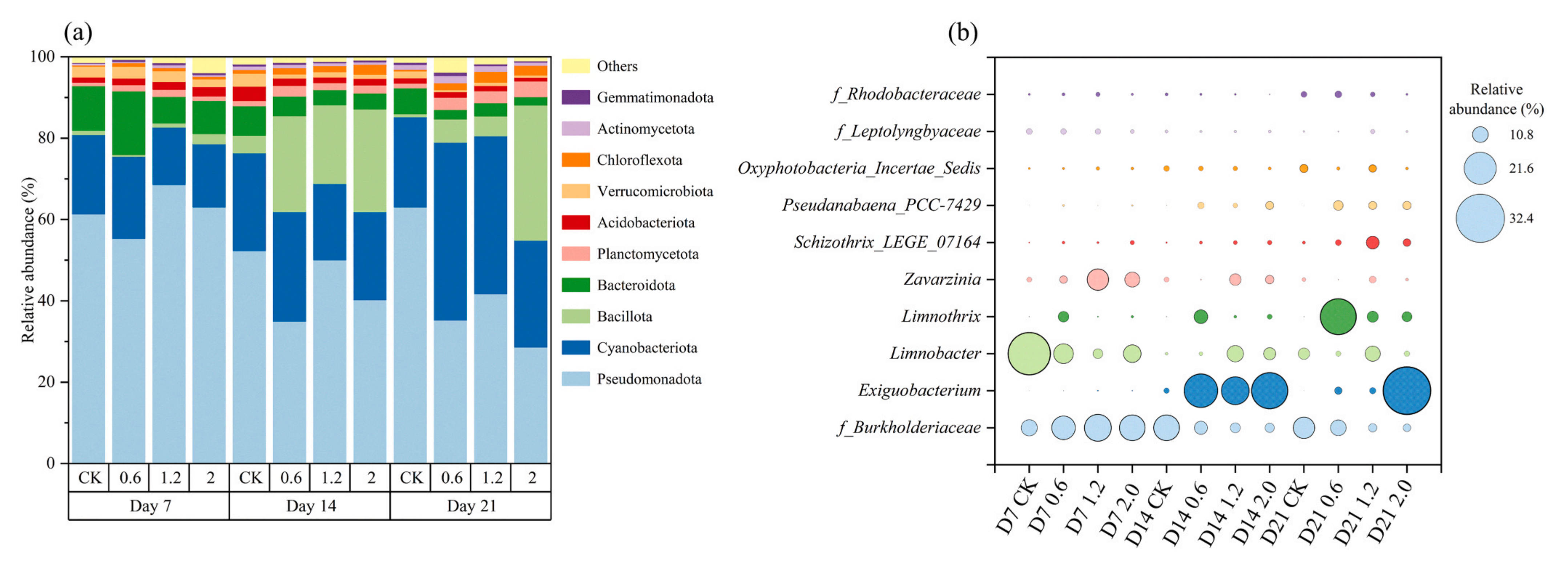 門水平的細菌群落組成結(jié)果顯示了微生物群落對Al暴露的動態(tài)響應(yīng)(圖3a)。變形菌門(28.64% ~ 68.58%)、藍細菌門(14.15% ~ 43.74%)、厚壁菌門(0.48% ~ 33.24%)和擬桿菌門(2.10% ~ 15.60%)是所有附著生物膜樣品中的優(yōu)勢菌群,廣泛存在于苦草葉片的附著生物膜。同時,變形菌門和擬桿菌門在各處理組中均占優(yōu)勢地位。然而,在濃度分別為1.2 mg/L和2.0 mg/L的Al處理21天后,兩個門的相對豐度均顯著低于CK組,說明這些細菌的增殖受到了Al暴露的影響。