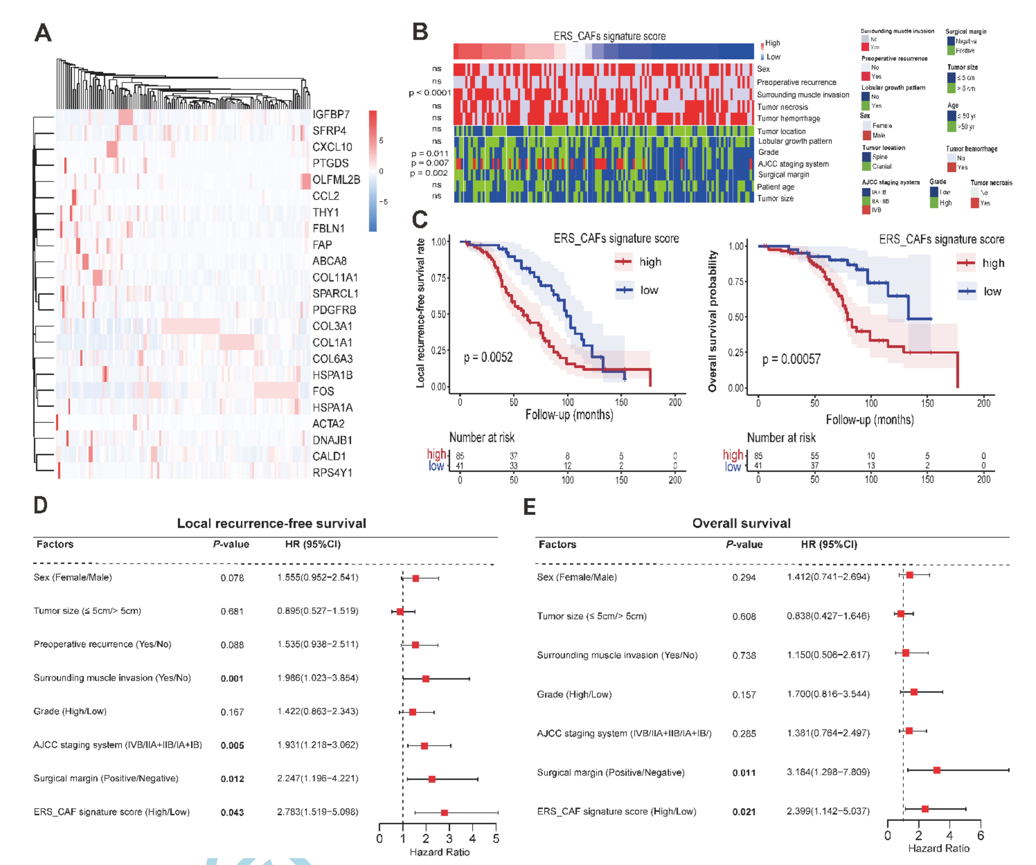 為了驗證 ERS-CAF 的促腫瘤作用,該研究對來自脊索瘤患者的 126 個樣本進行了總 RNA 測序(圖 4A)。使用代表該 CAF 子集的基因集計算每位患者的 ERS-CAF 特征評分,其中包括 ERS 相關(guān)基因(例如 HSPA1A、HSPA1B、CCL2 和 DNAJB1)和 CAF 特定標記(例如 THY1、FAP、?和 COL1A1)。ERS-CAF 特征評分與臨床數(shù)據(jù)之間的關(guān)系如圖 4B 所示。如上所示,ERS-CAF特征評分與腫瘤侵犯周圍肌肉(P?<?0.0001)、腫瘤分級(P?=?0.011)、AJCC分期(P?=?0.011)顯著相關(guān)。P?=?0.007)和手術(shù)切緣(P?=?0.002)。與原發(fā)腫瘤患者相比,復(fù)發(fā)腫瘤患者的 ERS-CAF 特征較高(-0.06?±?0.53 vs. -0.10?±?0.51),但這種差異并不具有統(tǒng)計學(xué)意義(t?=?-0.404)?,p?=?0.687)。對于生存分析,作者使用在線平臺確定ERS-CAF特征評分的閾值,并根據(jù)截止點將患者分為高(>截止)和低(≤截止)亞組。Kaplan-Meier 分析表明,ERS-CAF 特征評分的增加可預(yù)測不利的 LRFS 和 OS(圖 4C),在控制 Cox 多元回歸模型中的重要臨床因素后,這一結(jié)果仍然顯著(圖4D–E)。這些數(shù)據(jù)表明使用 GSVA 特征來反映脊索瘤組織中的 ERS-CAF 亞群的可靠性,并強調(diào)了 ERS-CAF 在調(diào)節(jié)腫瘤進展中的重要性。