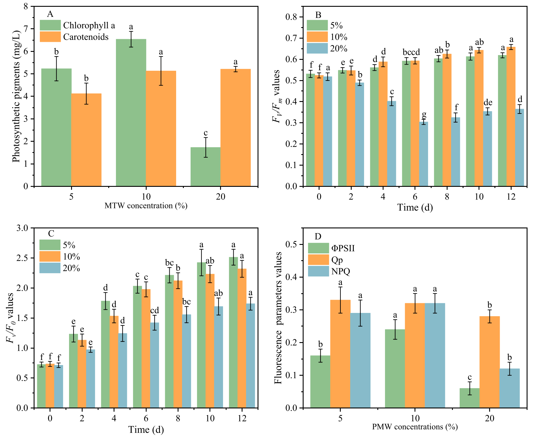 Fv/Fm檢測(cè)可以快速評(píng)價(jià)微藻對(duì)生長(zhǎng)環(huán)境的適應(yīng)性。隨著PMW濃度的增加,在圖2B中,在第12天,10% PMW的Fv/Fm最高(0.658)。與未添加PMW相比,5% PMW、10% PMW和20% PMW的Fv/Fm分別降低了8%、2%和46%。這表明藻類的能量轉(zhuǎn)化率降低,對(duì)微藻的光合作用有一定的抑制作用。在20%的PMW中,F(xiàn)v/Fm值恢復(fù),表明C. muelleri對(duì)不利環(huán)境產(chǎn)生了特異性抗性。Fv/F0可用于確定植物的光合效率和生理狀態(tài)。Fv/F0的下降(圖2C)表明C. muelleri供體側(cè)的水分裂復(fù)合物崩潰,導(dǎo)致電子傳遞能力下降。有效量子產(chǎn)率(ΦPSII)可以揭示微藻在不同環(huán)境條件下的生理狀態(tài)和PSII的性能。5%、10%和20% PMW組C. muelleri的ΦPSII分別為0.16、0.24和0.06(圖2D)??傮w而言,10% PMW處理下C. muelleri的光合效率最好,這也有利于PMW處理。