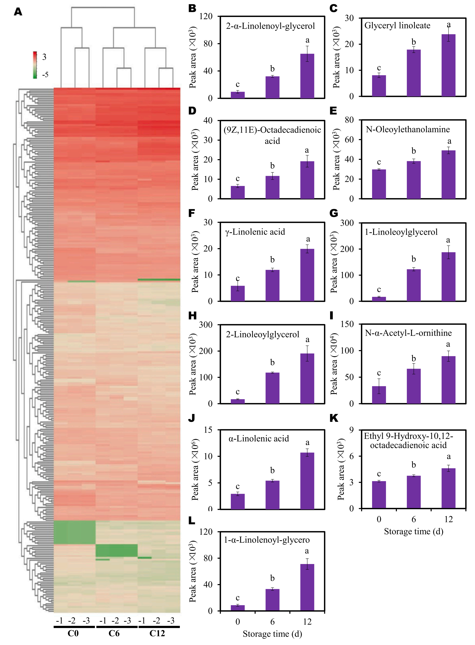 為進(jìn)一步分析代謝物在9個樣本的積累模式,該研究進(jìn)行了聚類熱圖分析。結(jié)果顯示,隨著貯藏時間的延長,褐變程度逐漸增加,推測持續(xù)增加的DAMs可能有助于切片芋頭的褐變或促進(jìn)其褐變過程。因此,該研究關(guān)注分析在褐變過程中豐度持續(xù)上升的DAMs (圖3B-L)。確定了11個DAMs在褐變過程中豐度持續(xù)增加,如2-α-亞麻烯酰甘油、甘油亞油酸、(9Z,11E)-十八烯二烯酸、N-油基乙醇胺、γ-亞麻酸、1-亞麻油基甘油、2-亞麻油基甘油、N-α-乙?;? L-鳥氨酸、α-亞麻酸、9-羥基-10、12-十八烯二烯酸和1-α-亞麻烯酰甘油。值得注意的是,在這11個DAMs中,有10個是脂肪酸或脂質(zhì)衍生物。幾種褐變指標(biāo)與這些水DAMs之間的相關(guān)系數(shù)非常高。這些結(jié)果表明,在切片芋頭中脂質(zhì)代謝與褐變發(fā)展之間存在潛在的聯(lián)系。