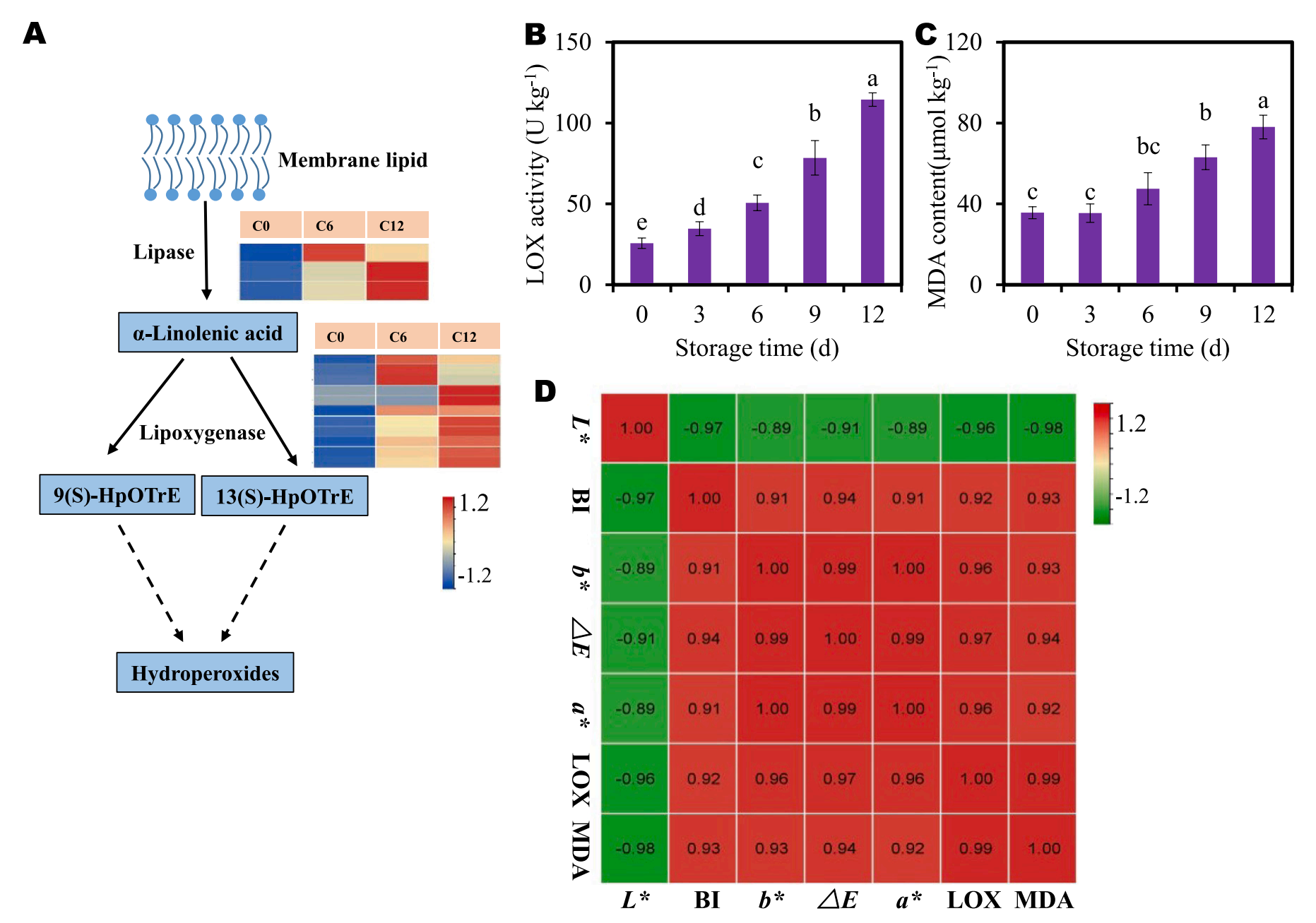 丙二醛通常被認(rèn)為是植物脂質(zhì)過氧化的生物標(biāo)志物。為了監(jiān)測切片芋頭褐變過程中膜脂過氧化情況,測定了LOX活性和MDA含量。隨著時間的推移,LOX活性和MDA含量隨著褐變繼續(xù)進(jìn)行逐漸升高 (圖7B, C)。這些結(jié)果表明,在褐變過程中,膜脂過氧化加劇。此外,相關(guān)分析顯示,LOX活性、MDA含量和其他褐變指標(biāo)之間存在很強(qiáng)的相關(guān)性?(圖7D)。這些結(jié)果進(jìn)一步支持了膜脂過氧化和/或代謝參與芋頭褐變。