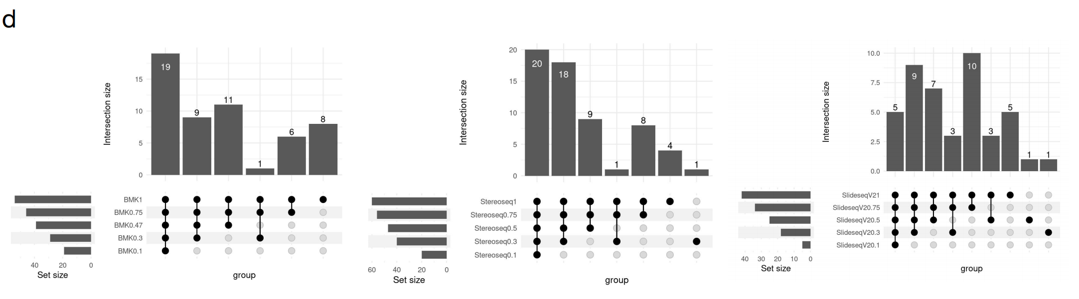 在各個平臺的捕獲性能測試中,文章通過對相同捕獲面積內(nèi)的UMI數(shù)進行統(tǒng)計,以此來進行捕獲效率的評判,文中分別對原始測序下,以及數(shù)據(jù)歸一化條件下,進行了統(tǒng)計,展示出了較大的差異,這意味著不同的測序量對UMI的檢出存在較大的影響,高的數(shù)據(jù)量可以明顯提升UMI的檢出,隱性表示空間組學(xué)應(yīng)需要比單細胞更高的測序深度。