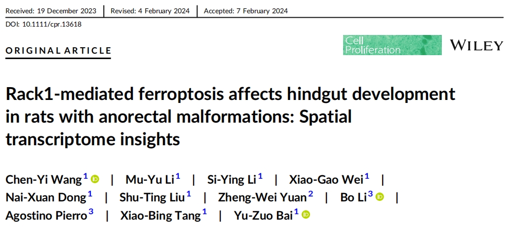2024年7月,中國醫(yī)科大學(xué)盛京醫(yī)院在國際學(xué)術(shù)期刊cell proliferation發(fā)表一項重要研究成果,題為:Rack1‐mediated ferroptosis affects hindgut development in rats with anorectal malformations: Spatial transcriptome insights。使用空間轉(zhuǎn)錄組測序、免疫熒光、CCK-8、WB、ROS檢測等來剖析直腸肛門畸形的發(fā)育機(jī)制。