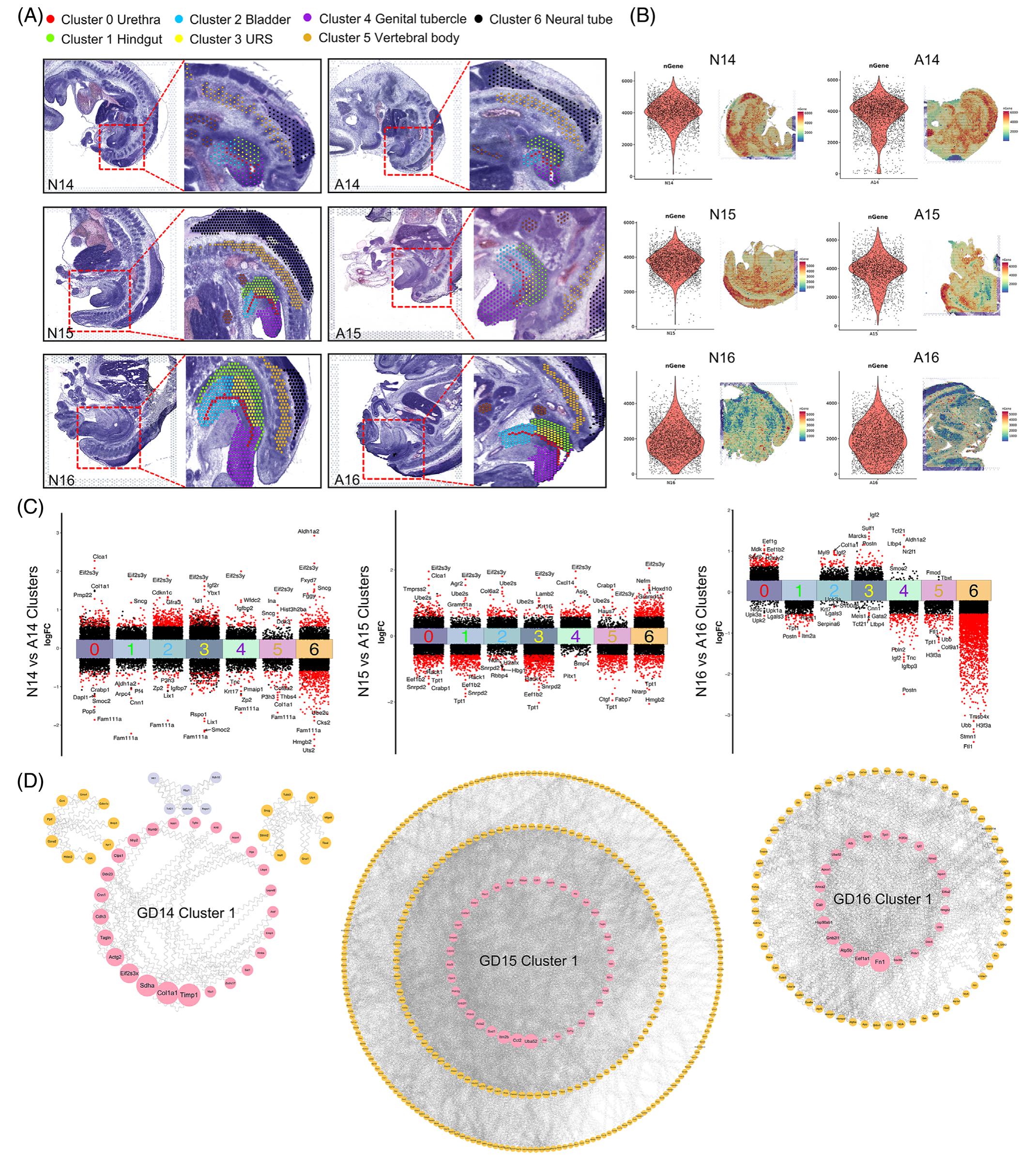 在這項研究中,作者在 GDs 14-16 (稱為 N14-16) 上使用正常的 Wistar 大鼠胚胎,在 GDs 14-16 (稱為 A14-16) 上使用 ETU 誘導(dǎo)的 ARM 胚胎進(jìn)行空間轉(zhuǎn)錄組測序。制備大鼠胚胎的 6 個冷凍中矢狀切片,每個 10 μm 厚。這些切片包括尿道和后腸層,提供了特定時間點泄殖腔發(fā)育的全面視圖(圖 1A)。使用 10× Genomics Visium 空間轉(zhuǎn)錄組技術(shù),然后進(jìn)行組織透化、cDNA 合成和文庫構(gòu)建,作者成功地捕獲了正常和 ARM 胚胎中的視覺基因轉(zhuǎn)錄數(shù)據(jù),主要來自泄殖腔區(qū)域。為了確保來自同一區(qū)域的各種切片樣本之間的可比性和一致性,作者進(jìn)行了聚類注釋,產(chǎn)生了七個不同的聚類。這些集群包括泄殖腔區(qū)域內(nèi)的五個特定區(qū)域(集群 0-4),即尿道、后腸、膀胱、URS 和生殖器結(jié)節(jié)。此外,兩個簇 (簇 5 和 6) 對應(yīng)于椎體和神經(jīng)管區(qū)域 (圖 1A)。平均而言,每個解剖區(qū)域覆蓋 3005 個點,每個點捕獲 16,905 個基因(圖 1B)。