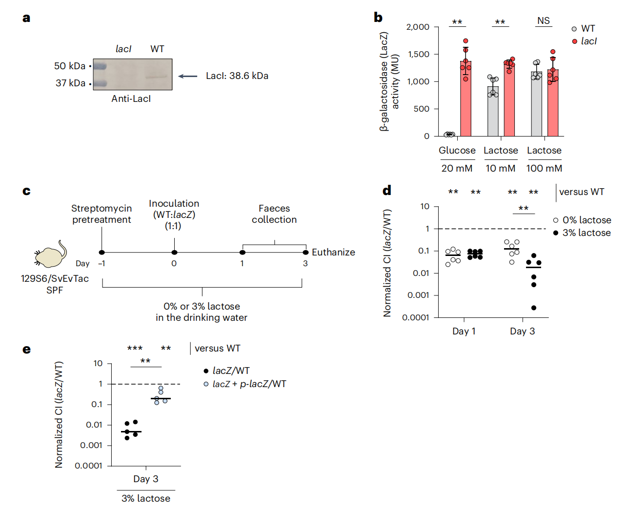 研究人員使用小鼠模型,比較了野生型大腸桿菌 8178 菌株和 lacZ 突變體菌株在富含乳糖條件下的生長(zhǎng)情況。結(jié)果顯示,野生型菌株的生長(zhǎng)速度更快,這表明 lacZYA 操縱子在腸道定植中起著重要作用。lacZYA 操縱子負(fù)責(zé)乳糖的代謝,野生型菌株能夠更有效地利用乳糖,從而獲得競(jìng)爭(zhēng)優(yōu)勢(shì)。