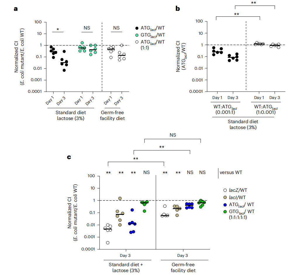 研究人員在不同的小鼠模型和飲食條件下,比較了 lacZ 突變體菌株的適應(yīng)性。結(jié)果顯示,在不同條件下,lacZ 突變體菌株的適應(yīng)性表現(xiàn)出差異,這表明 lacI GTG 起始密碼子的優(yōu)勢(shì)是上下依賴(lài)性的。例如,在無(wú)菌小鼠中,lacZ 突變體菌株的生長(zhǎng)劣勢(shì)更加明顯,這表明腸道微生物群可能對(duì) lacZYA 操縱子的活性產(chǎn)生影響。此外,不同飲食中乳糖含量的差異也可能影響 lacZ 突變體菌株的適應(yīng)性。