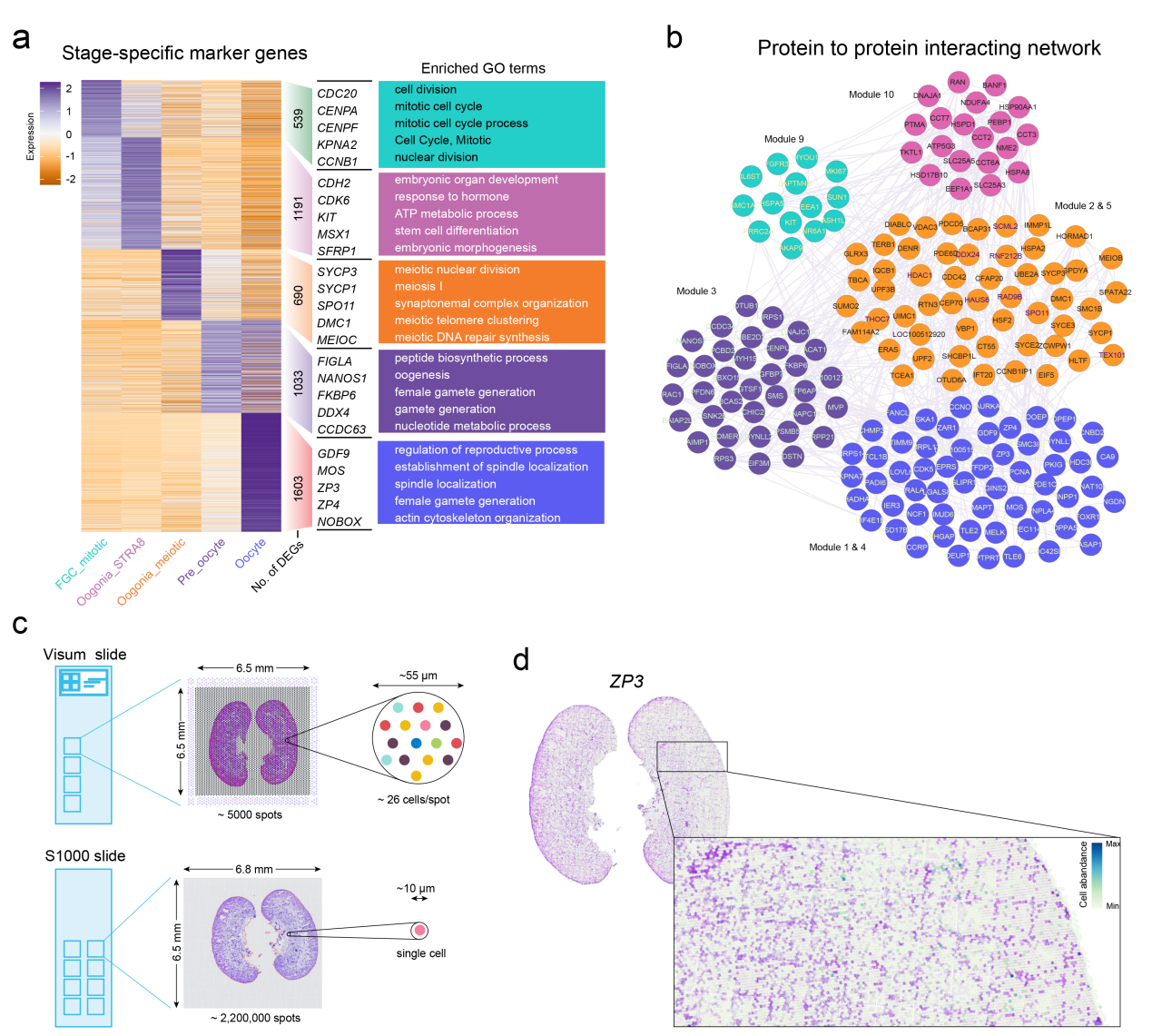 為了進(jìn)一步驗(yàn)證分析,研究人員還在同一E65卵巢組織上使用了更高分辨率(BMKMANU S1000;Spot點(diǎn)大小約為10微米)的平臺(tái)進(jìn)行了ST測(cè)序。結(jié)果與E65時(shí)的Visium ST解卷積一致,使用S1000平臺(tái)在E65時(shí)可視化ZP3陽(yáng)性卵母細(xì)胞的空間位置也證實(shí)了其在內(nèi)皮層的表達(dá)。