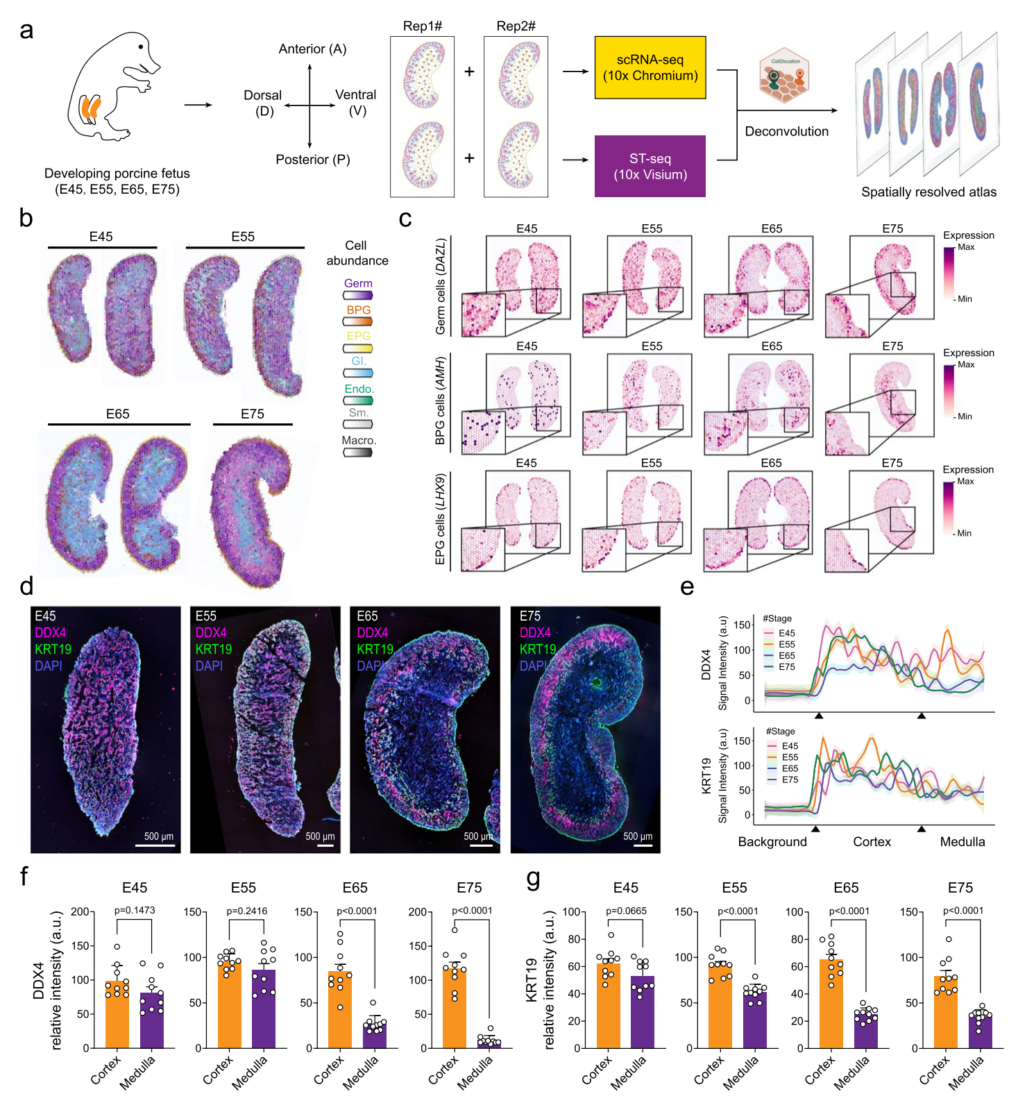 為進(jìn)一步驗(yàn)證分析結(jié)果,研究者進(jìn)行了全組織染色實(shí)驗(yàn),使用生殖細(xì)胞標(biāo)志物DDX4和前顆粒細(xì)胞標(biāo)志物KRT19對(duì)E45至E75的胎兒卵巢進(jìn)行染色,實(shí)驗(yàn)結(jié)果與ST數(shù)據(jù)分析結(jié)果一致。此外,研究者還分析了這些陽(yáng)性細(xì)胞在卵巢背腹軸上的空間分布,并通過(guò)熒光強(qiáng)度分析確認(rèn)了生殖細(xì)胞和前顆粒細(xì)胞在皮層和髓質(zhì)區(qū)域的不同分布模式。這些發(fā)現(xiàn)為深入理解豬卵巢發(fā)育過(guò)程中細(xì)胞類型的空間動(dòng)態(tài)變化提供了重要線索。