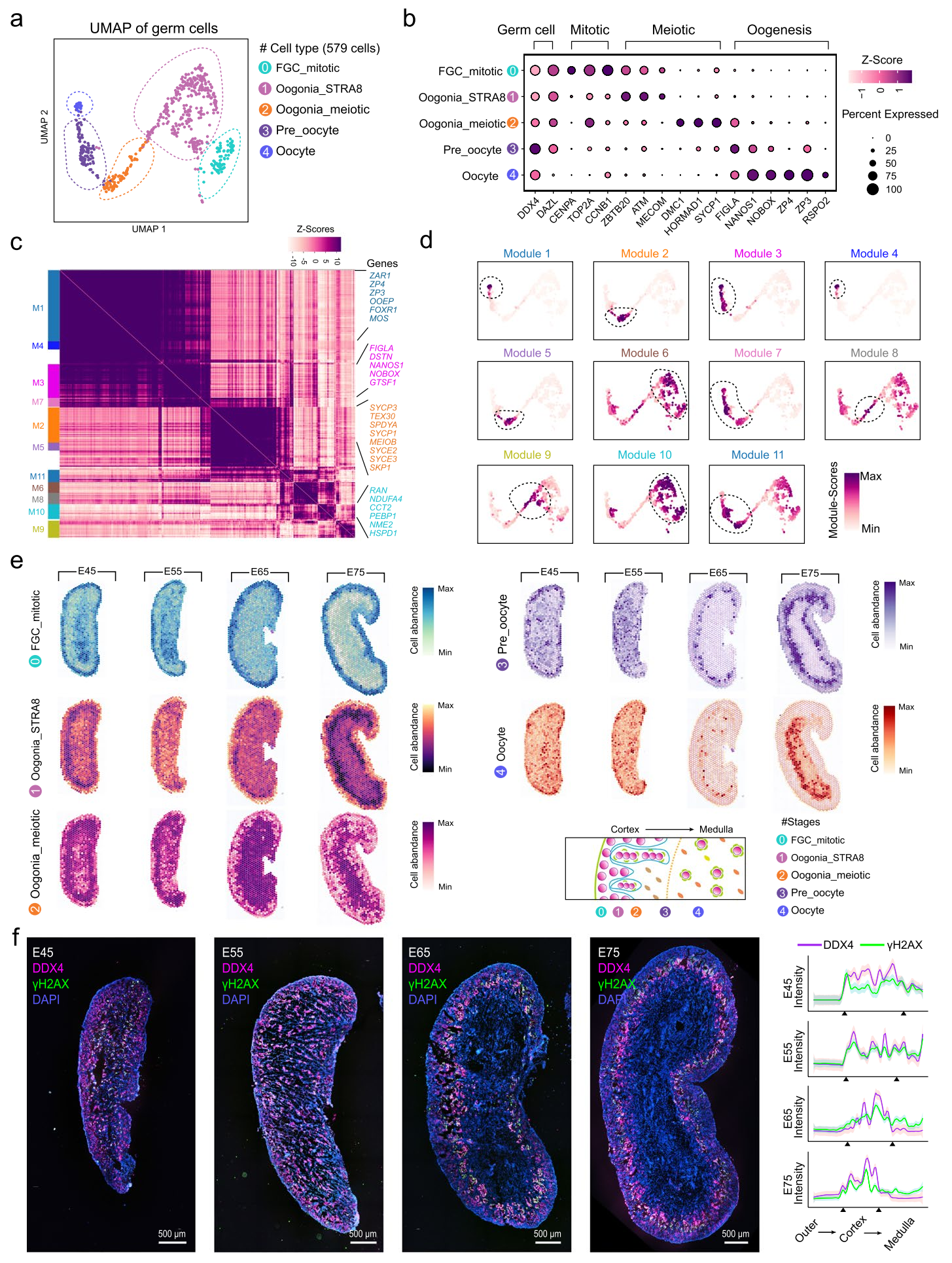 為了深入了解早期豬卵母細(xì)胞生成過(guò)程中模塊基因的功能富集情況,研究人員采用Hotspot算法,利用生殖細(xì)胞的scRNA-seq數(shù)據(jù)識(shí)別了相關(guān)基因模塊,共鑒定出11個(gè)功能各異的基因模塊。通過(guò)將單個(gè)模塊投影到UMAP圖中,確定了具有簇特異性的信息性基因模塊。剖析了早期豬卵母細(xì)胞生成過(guò)程中的基因表達(dá)譜后,研究人員進(jìn)一步在空間環(huán)境中研究了這一過(guò)程。通過(guò)對(duì)ST芯片上的生殖細(xì)胞進(jìn)行解卷積,揭示了早期卵母細(xì)胞生成的皮質(zhì)-髓質(zhì)梯度。為了驗(yàn)證上述分析,研究人員使用生殖細(xì)胞標(biāo)記DDX4和減數(shù)分裂生殖細(xì)胞細(xì)線期標(biāo)記γH2AX進(jìn)行了全組織染色實(shí)驗(yàn),以定位在不同階段啟動(dòng)減數(shù)程序的生殖細(xì)胞。評(píng)估了C-M軸的熒光強(qiáng)度后發(fā)現(xiàn)在E45和E55卵巢中,γH2AX信號(hào)沿C-M軸的水平相似,而在E65至E75卵巢中,γH2AX信號(hào)在內(nèi)皮層達(dá)到峰值,在髓質(zhì)區(qū)域則減少。