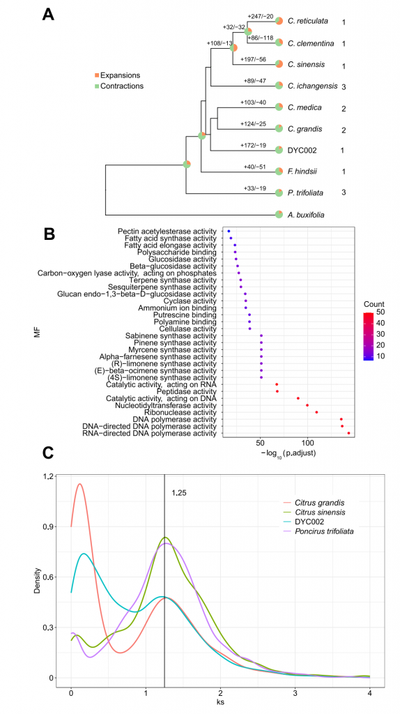 高質(zhì)量基因組的發(fā)表對(duì)了解柑橘發(fā)揮重要作用。然而,由于其復(fù)雜的遺傳背景,許多柑橘物種的起源和進(jìn)化仍不清楚。作者從頭組裝了DYC002的294mbp染色體水平的基因組,對(duì)兩個(gè)單倍型基因組比較,發(fā)現(xiàn)了1.2%的基因組內(nèi)變異,包括175 萬個(gè)SNPs,149,471個(gè)插入和154,215個(gè)缺失。以該基因組為參考,對(duì)378份具有代表性的柑橘材料進(jìn)行了重測(cè)序和系統(tǒng)發(fā)育分析,作者研究柑橘屬可分為兩個(gè)進(jìn)化支,證實(shí)了柑橘核心種的主要起源中心是華南地區(qū),特別是喜馬拉雅-橫斷山脈。該研究為了解柑橘品種的起源和進(jìn)化提供了新的視角,并可能為柑橘育種和改良提供有價(jià)值的基因組資源。