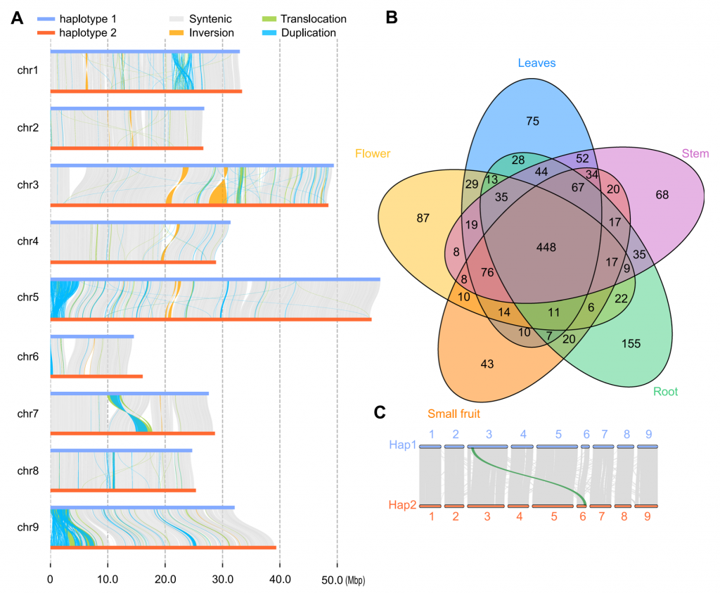 利用CCS數(shù)據(jù)和HIC數(shù)據(jù),作者組裝出DYC002的兩套單倍型基因組,長度分別為294和300 Mbp,注釋的基因數(shù)量分別為28000和27785個(gè);BUSCO完整度分別為97.39%和97.33%。通過比較分析,兩單倍型基因組間存在175萬個(gè)SNPs,303,686個(gè)Indels,轉(zhuǎn)錄組分析表明,兩個(gè)單倍型中等位基因的表達(dá)高度一致。葉片中等位基因特異性表達(dá)基因(ASEGs)數(shù)量最高,而花中數(shù)量最低。在單倍型1和單倍型2的組裝中分別發(fā)現(xiàn)了535個(gè)和499個(gè)單倍型特異性基因。
