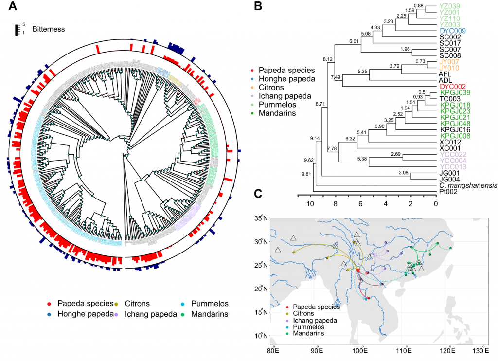 柑橘是世界上種植最廣泛的水果之一,目前在140多個(gè)國家和地區(qū)種植。雖然過去的二十年里柑橘植物的種群結(jié)構(gòu)和遺傳多樣性已被調(diào)查,但由于其豐富的資源類型和雜交頻繁,許多柑橘物種的起源和進(jìn)化仍不清楚。野生柑橘物種和原始柑橘保存了豐富的遺傳資源和遺傳多樣性,可用于闡明柑橘物種的起源和進(jìn)化。2015年,在西雙版納發(fā)現(xiàn)一棵200多年的野生柑橘樹大翼葉柑橘(DYC002),被認(rèn)為是研究柑橘進(jìn)化及苦味馴化的很好材料。