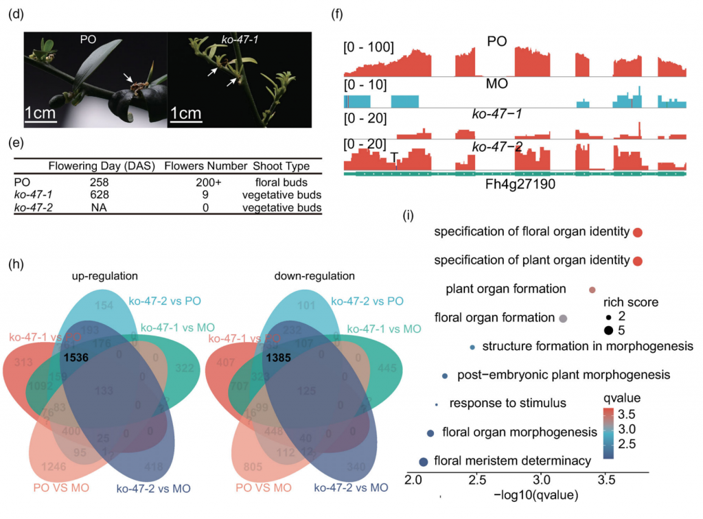 作者之前的研究顯示的雜合子插入MITE啟動(dòng)子區(qū)域和一個(gè)FhRWP的CDS序列區(qū)域SNP(C-G),導(dǎo)致這個(gè)基因的分裂成兩個(gè)單倍型,M等位基因(MITE)和P等位基因(沒有MITE)。根據(jù)Mo和PO腋芽的轉(zhuǎn)錄組結(jié)果,作者發(fā)現(xiàn)PO中RWP轉(zhuǎn)錄本高表達(dá)P等位基因,而Mo中M等位基因表達(dá)較小,于是作者構(gòu)建了CRISPR/Cas9載體,以敲除FhRWP,結(jié)果表明,插入MITE可以通過促進(jìn)含有MITE的P等位基因的表達(dá),同時(shí)減少不插入MITE的M等位基因的表達(dá),從而改變該基因的表達(dá)模式。雖然FhRWP在ko-47-1和ko-47-2中的FhRWP的表達(dá)下降到與Mo一致的水平,但P等位基因突變導(dǎo)致的過早終止導(dǎo)致了FhRWP功能的喪失,因此,ko-47-1和ko-47-2植株表現(xiàn)出新的表型,如生長遲緩和花芽分化失敗。