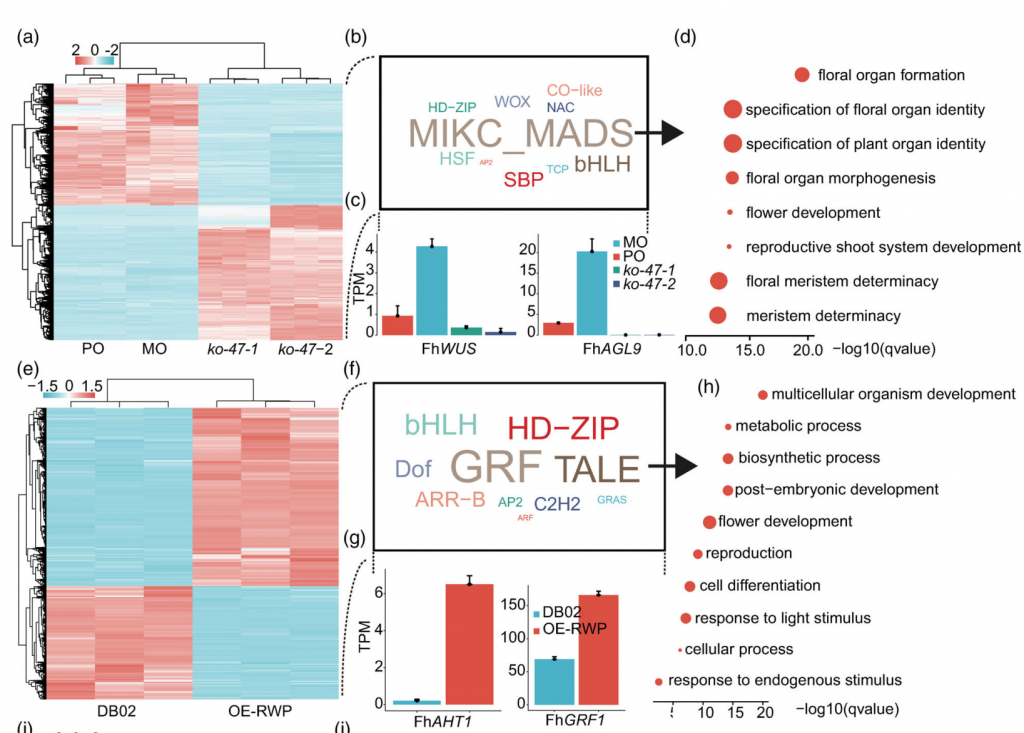 多項(xiàng)實(shí)驗(yàn)結(jié)果表明,F(xiàn)hRWP在協(xié)調(diào)細(xì)胞命運(yùn)和啟動(dòng)植物再生和繁殖過程中起著關(guān)鍵作用,因此,該研究對腋芽MO/PO胚珠的表達(dá)數(shù)據(jù)進(jìn)行了整合的轉(zhuǎn)錄組分析。差異基因在花器官發(fā)生和繁殖相關(guān)的生物過程顯著富集,其中來自MADS和WOX等基因家族的轉(zhuǎn)錄因子,包括FhWUS和FhAGL6,均顯著富集,在過表達(dá)的愈傷組織中,共鑒定出354個(gè)差異表達(dá)的轉(zhuǎn)錄因子,GO注釋顯示與胚胎后發(fā)育和再生相關(guān)的過程顯著相關(guān)。值得注意的是,屬于GRF和TALE等基因家族的轉(zhuǎn)錄因子,包括FhAHT1和FhGRF1,表現(xiàn)出顯著的富集,這些基因已被廣泛報(bào)道參與光形態(tài)建成、葉片發(fā)育等信號通路。